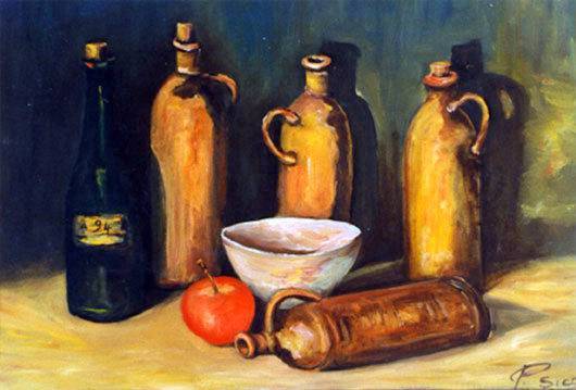 Obraz przedstawia starannie zaaranżowaną martwą naturę, która przypomina coś z dawnych epok. Widzimy kilka brązowych butelek i jedną ciemnozieloną, które dumnie stoją po lewej stronie. Są jak wysocy strażnicy spoglądający na swoje królestwo. Na blacie leży czerwona jak ogień pomidora, a odcień jego skóry aż kusi do sięgnięcia po niego. Przedmioty tworzą pełną harmonii kompozycję. Tło w odcieniach ciemnej zieleni i niebieskiego, daje poczucie głębi i tajemnicy. Artysta posługuje się śmiałymi, wyrazistymi pociągnięciami pędzla. Technika impasto pozwala skupić się na fakturze, niemal czujemy chropowatość powierzchni. Daje poczucie ciepła i nostalgii. Brązy i beże tworzą spokojny, wręcz introwertyczny nastrój. Emocje tego obrazu mogą przywołać wspomnienia domowego spokoju. Dziecko powiedziałoby: "To moje ulubione butelki". It's like a journey back in time. Wydaje się, że to moment zamknięty w czasie, który zachęca do refleksji nad kruchością codziennych chwil.