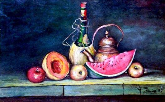 Obraz przedstawia martwą naturę pełną kolorów i życia. Na drewnianym stole spoczywa butelka wina obwiązana sznurem, otoczona przez soczyste owoce - arbuza, brzoskwinię i jabłka. Po prawej stronie uwagę przyciąga miedziany czajnik, który wydaje się mieć swoją historię. Kolory są intensywnie nasycone, z przewagą ciepłych odcieni czerwieni, pomarańczy i zieleni. Kompozycja jest harmonijna, przedmioty rozmieszczone z przemyślaną precyzją. Obraz emanuje spokojem, przypominając letnie popołudnie na wsi, gdzie czas płynie wolniej. Artystyczny styl obrazu przypomina klasyczne martwe natury, z naciskiem na szczegóły i realistyczne odwzorowanie obiektów. Technika malarska nosi znamiona tradycyjnego olejnego pędzla, z delikatnymi, ale wyraźnymi pociągnięciami. Patrząc na to dzieło, czuję się jakby można było niemalże wziąć arbuz do ręki i poczuć jego chłód i soczystość. To trochę jak z magicznym pudełkiem, w którym zatrzymano upływ czasu. "Ten arbuz wygląda jak ufo!" mogłoby powiedzieć siedmioletnie dziecko, widząc, jak jego czerwony miąższ błyszczy. Obraz jest po prostu stunning. Zatrzymuje na chwilę codzienność, przypominając, by cieszyć się małymi rzeczami. To taka mała, artystyczna podróż do świata pełnego smaków i historii.