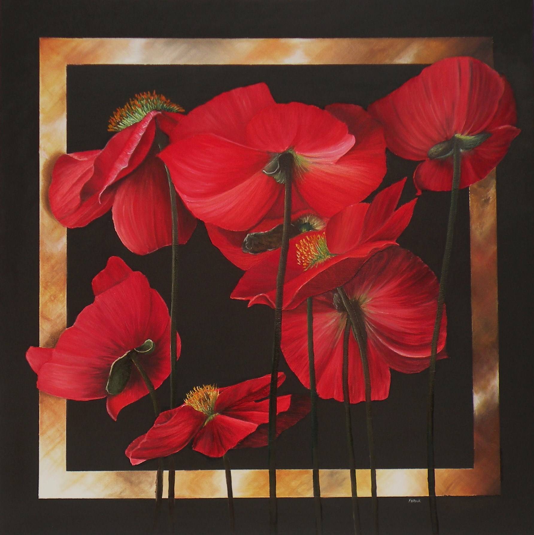 Na obrazie widzimy bogate, czerwone maki, które swoim blaskiem kontrastują z głębokim, czarnym tłem. Kwiaty są pełne życia, ich płatki zdają się niemal tańczyć. Przypominają jedwab, który delikatnie faluje na wietrze. Kompozycja jest bardzo harmonijna i skupia uwagę na centrum obrazu. Obraz jest framed z subtelną, złotawą ramką, która dodaje mu elegancji, ale nie przytłacza. Atmosfera jest jednocześnie spokojna i żywiołowa. Widz może odczuwać melancholię, patrząc na te piękne, lecz ulotne kwiaty. Styl artystyczny przypomina klasyczny realizm, w detalach widać studiowanie natury. Artysta użył bogatej palety kolorów, by oddać głębię i teksturę płatków. To prawdziwy "showstopper" w swojej prostocie. Każdy płatek opowiada własną historię – pełną chwilowego piękna i kruchej doskonałości. Obraz może budzić w nas poczucie ulotności piękna i przypominać o przemijaniu. Ja chciałbym taki mak zerwać i dać mamie, bo jest ładny. Patrząc na niego, czuję głęboką zadumę i nostalgia miesza się z podziwem. Kwiaty stają się metaforą życia – krótkiego, ale o ogromnym znaczeniu.