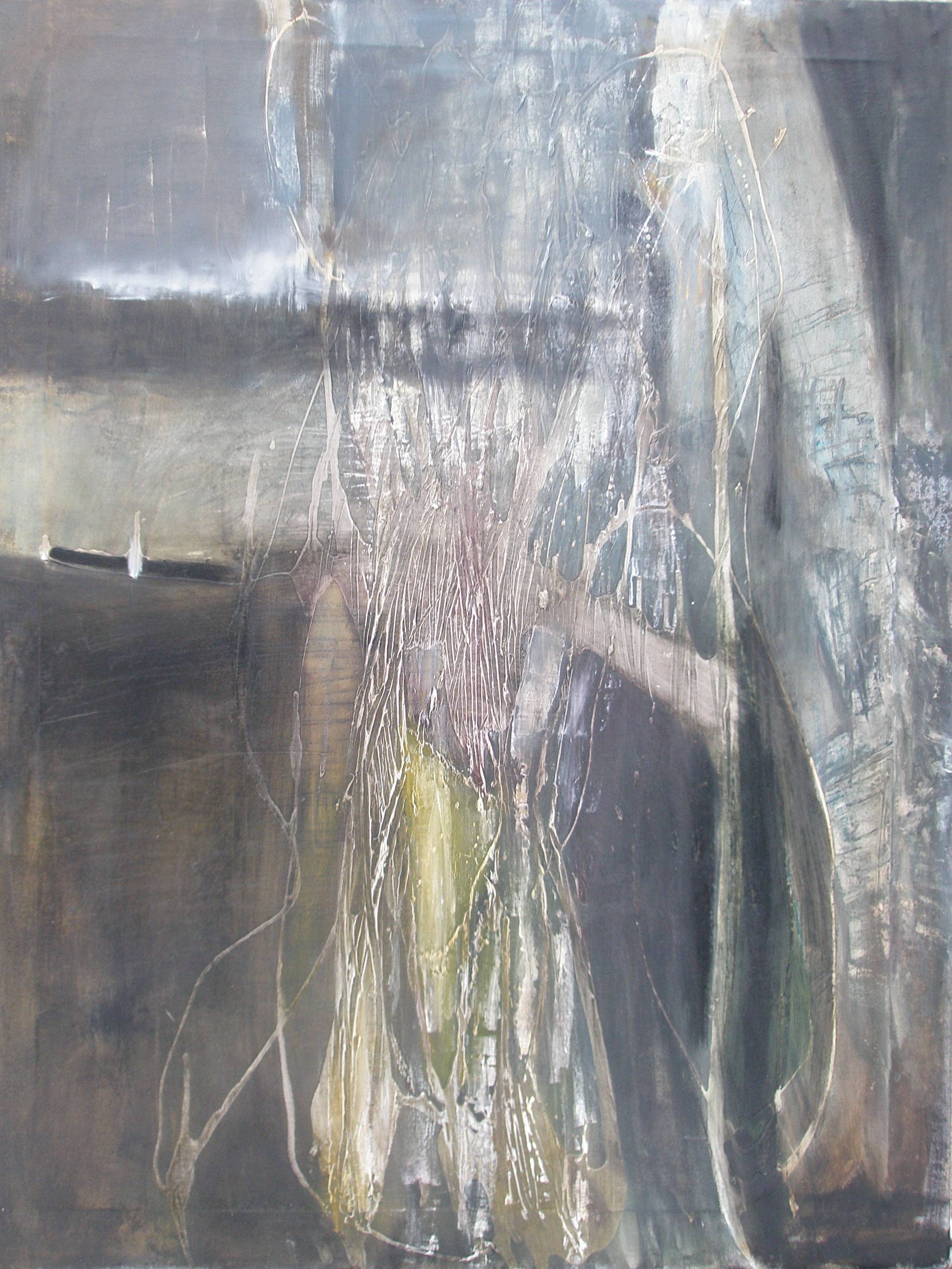 Obraz ma w sobie coś tajemniczego, coś, co przyciąga wzrok, ale jednocześnie każe się zadumać. Dominuje tu chłodna paleta kolorów. Szarości mieszają się z ciemnymi tonami, a gdzieniegdzie przebijają się subtelne odcienie zieleni i beżu. Całość tworzy kompozycję abstrakcyjną, pełną nieoczywistych kształtów i zawirowań. Wydaje się, że artysta użył oleju albo farb akrylowych, zastosował technikę impastową z warstwami o zróżnicowanej grubości. Strumienie białych linii przecinają obraz niczym rysowane przez dziecko, dodając mu ruchu. Atmosfera dzieła jest pełna spokoju, ale i melancholii, jak deszczowy dzień za oknem. Dla mnie, wygląda trochę jak marzenie senne, gdzie wszystko jest niewyraźne, ale pełne emocji. I jest taka cisza, jakby obraz coś szeptał. Wywołuje to refleksję nad przemijaniem i pięknem niedoskonałości. "Wow, jakie to fajne!" - powiedziałoby dziecko widząc te wszystkie plamy i linie. Obraz może budzić skojarzenia z życiem we wszystkich jego aspektach. Czasem jest chaotyczne, innym razem spokojne i przewidywalne. Jest to naprawdę captivating dzieło, które na długo pozostaje w pamięci. Interesujące jest, jak artysta bawi się fakturą, tworząc iluzję głębi. To jakby spojrzenie do wnętrza świata, który jest nam bliski, a zarazem obcy.