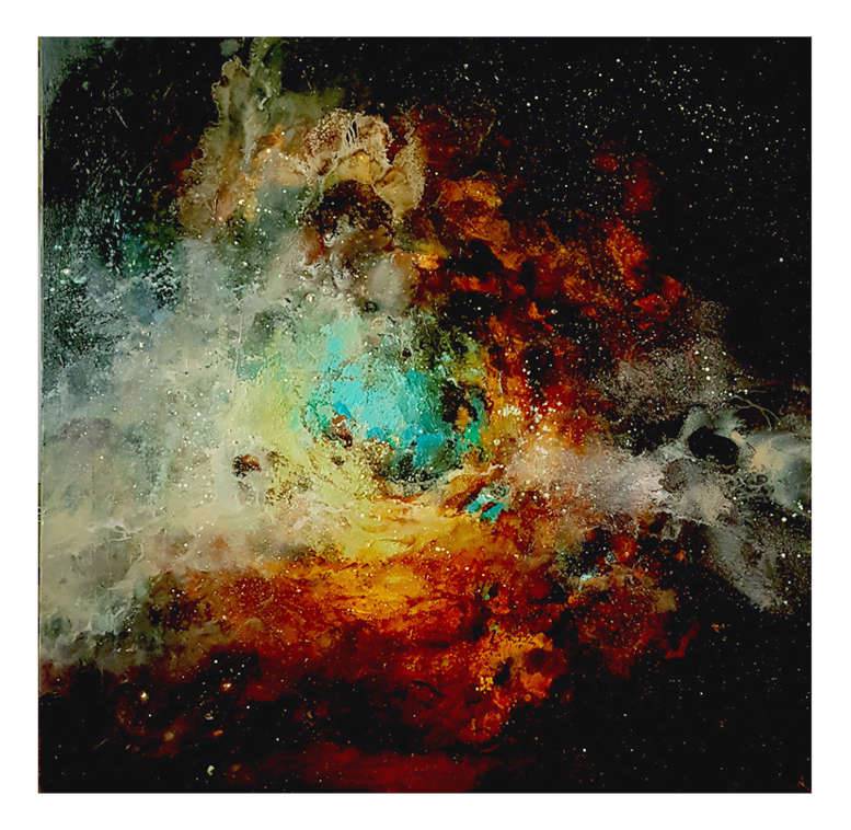 Obraz wciąga swoją kosmiczną atmosferą od pierwszego spojrzenia. Dominujący, głęboki czarny kolor tła kontrastuje z eksplozją barw pośrodku. Tu wirują odcienie pomarańczu, błękitu i bieli, jakby ktoś mieszał paletę we wnętrzu galaktyki. Kompozycja przypomina wybuch gwiazdy, pełna dynamizmu i ruchu, fascynując swoją nieprzewidywalnością. Artysta zastosował technikę, która przypomina akwarelę zmieszaną z czymś a'la gęsty olej, co tworzy unikalny efekt przypominający mgławicę w dalekim kosmosie. Emocje kipią z tej pracy - można poczuć się, jakbyśmy stali na progu wszechświata, równocześnie mali i zagubieni, ale też fascynujący i ciekawi. Mamo, to wygląda jak wybuch kolorowego balonika! To zdanie pasuje tutaj idealnie. Wprowadza dziecięcą prostotę, która dodaje ciepła i humoru do całości. Dzieło to wywołuje poczucie awe i tajemnicy, ale też pewien niepokój. Może przypominać o nieskończoności i pięknie kosmosu, którego jeszcze nie zdołaliśmy w pełni pojąć. Fascynujące jest również, jak zastosowanie kontrastujących barw i niejednorodnej faktury przyciąga wzrok, zatrzymując go na dłużej. To jest prawdziwy "eye-opener". Obraz prowokuje refleksję nad naszym miejscem we wszechświecie, nad złożonością i pięknem tego, co nieodgadnione.