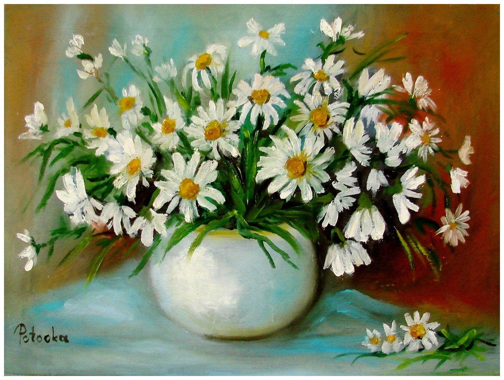Na tym obrazie rozkwitają rumianki , królujące w eleganckiej białej wazie. Kwitną bielą płatków i żółcią środków, które przyciągają wzrok. Tło obrazu utrzymane w pastelowych odcieniach błękitu i brązu dodaje całości subtelnej głębi i ciepła. Jest jak cichy poranek pełen świeżości i spokoju, który niesie za sobą odrobinę nostalgii za beztroskimi chwilami. Artysta posługuje się techniką impastu, nanosząc farbę grubymi warstwami, co dodaje tekstury i ruchu. Widać tu swobodne pociągnięcia pędzla wyrażające dynamikę i lekkość. Obraz sygnowany, werniksowany.