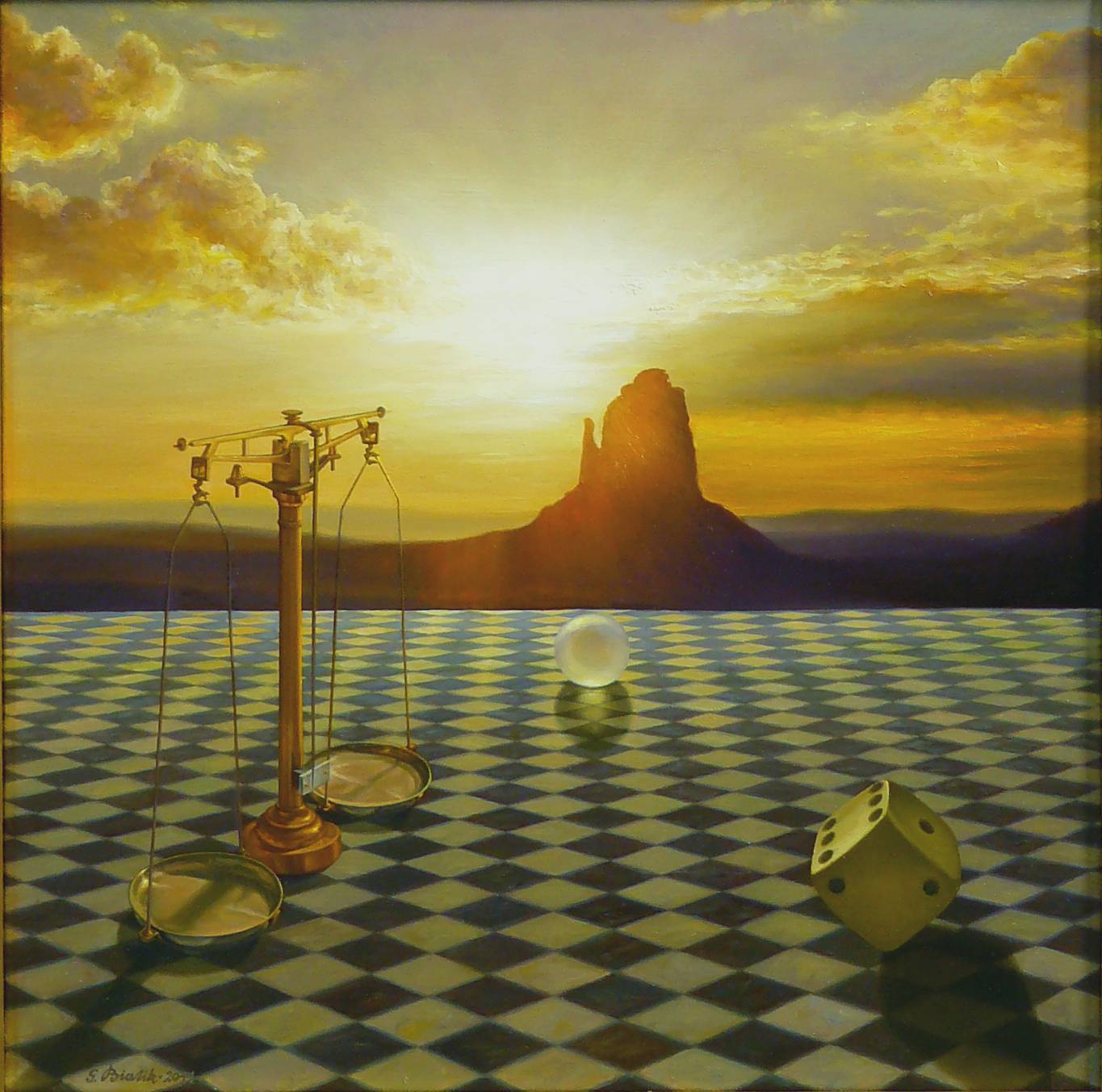 Na tym obrazie widzimy niezwykłą kompozycję, gdzie złoty, promienny zachód słońca oświetla szachownicę, tworzącą głęboką perspektywę. Na pierwszym planie znajduje się waga, delikatnie odchylona, obok której spoczywa przezroczysta kula i kostka do gry. Wszystko spowite jest w ciepłe, złote i pomarańczowe odcienie. Ta scena wydaje się być z pogranicza rzeczywistości i marzeń, emanując spokojem i tajemnicą. Artysta używa techniki olejnej, co nadaje miękkość chmurom i głębię kolorom. Atmosfera obrazu jest wręcz magiczna. Przestrzeń wydaje się tajemniczo nieokreślona, pełna "enigmy". Obecność kuli i kostki symbolizuje losowość, a waga może odnosić się do poszukiwania balansu w życiu. Może to wywołać liczne interpretacje u widza: poczucie równowagi, poszukiwanie harmonii, czy też pytania o nieuchronność wyborów. Obraz skłania mnie do refleksji o kruchości i równowadze w codzienności. Jakby chciał powiedzieć: "Zatrzymaj się na chwilę. Zastanów się, co jest ważne". A dziecko powiedziałoby: "Patrz, jest kostka i kula!". Mieszanka tak wielu elementów może intrygować, wciągać. Patrząc na ten obraz, trudno nie zatracić się w jego nieskończoności i cudownej niejednoznaczności.