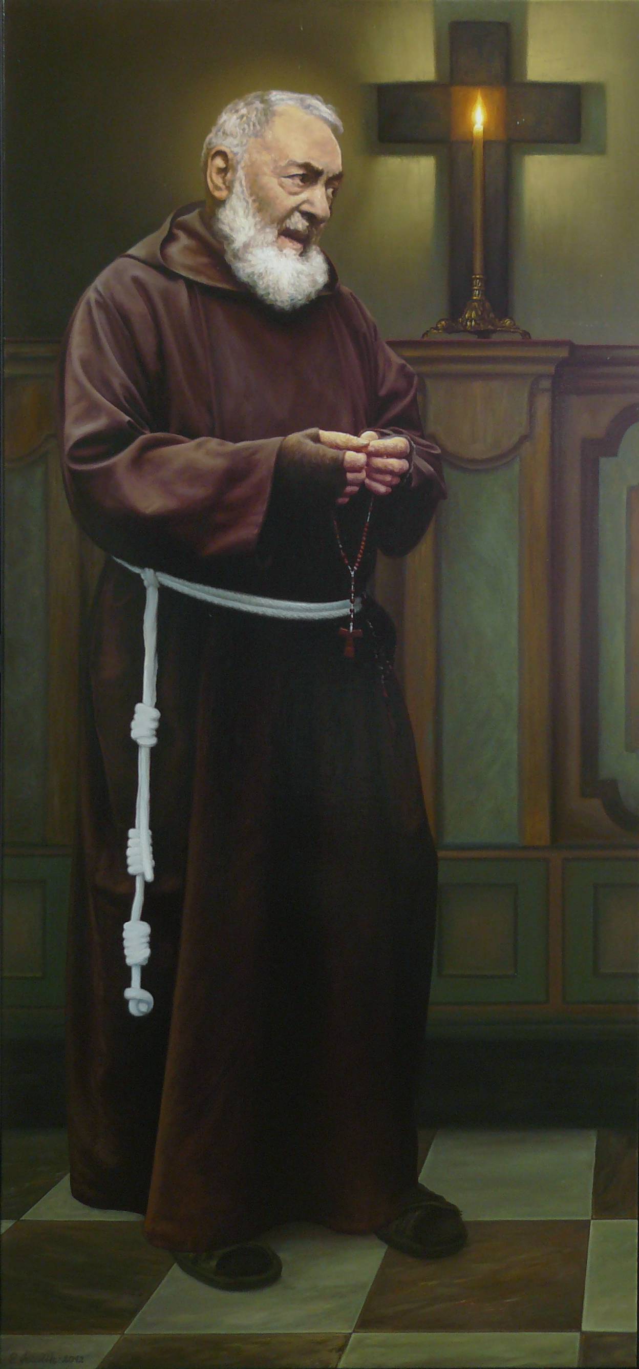 Na obrazie widzimy postać zakonnika o spokojnym i refleksyjnym wyrazie twarzy. Ubrany w brązowy habit przepasany białym sznurem, trzyma różaniec, co dodaje mu powagi i skupienia. W tle widoczny jest drewniany krzyż i płonąca świeca, które subtelnie podkreślają duchowy wymiar sceny. Barwy obrazu są stonowane, dominują brązy i zielenie, co nadaje całości ciepły i spokojny charakter. Kompozycja jest wyważona, co sprawia, że całość wydaje się harmonijna i pełna wewnętrznego spokoju. Artysta zastosował realistyczny styl, z dużą dbałością o detale, co widać choćby w fakturze materiału habita. Obraz emanuje atmosferą ciszy i kontemplacji. Widz może odczuć spokój i duchowe skupienie, jakie przedstawiona postać wnosi do otoczenia. Odbiorca może poczuć się zaproszony do refleksji nad własnym życiem i wartościami. Jak mówi mały Jasio: "Ten pan wygląda jak chce się pomodlić." Technika malarska, bogata w szczegóły, sprawia, że każdy element obrazu wydaje się niemal namacalny, a ciepłe, subtelne światło tworzy idealną „glow” wokół postaci, sugerując jej świętość. Obraz może wzbudzać w widzu uczucie podziwu dla prostoty i pokory zakonnego życia, jednocześnie skłaniając do przemyśleń o własnej duchowej drodze. To dzieło, które poprzez swoją prostotę i głębię może przyciągać na dłużej, pozwalając się zatopić w cichym dialogu z jego przesłaniem.