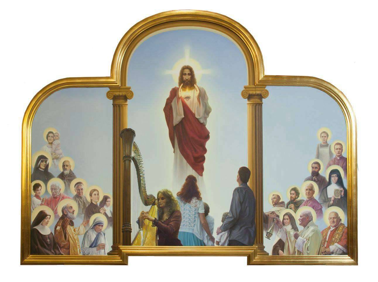 Na obrazie widzimy majestatyczną scenę z centralnie umieszczoną postacią w czerwono-białej szacie, otoczoną blaskiem. Postać unosi się lekko nad ziemią, a jej spokojne spojrzenie przyciąga uwagę. Tło jest delikatnie niebieskie, co dodaje spokojnej atmosfery. Po obu stronach zgromadzenie świętych i postacie historyczne, które wydają się być zanurzone w duchowej rozmowie. Są ubrane w tradycyjne, często historyczne stroje, co podkreśla różnorodność czasu i przestrzeni. Kompozycja obrazu jest symetryczna, z centralnym punktem skupiającym uwagę widza. Artysta zastosował miękkie przejścia między kolorami, co nadaje całości harmonii. Styl jest realistyczny, z dbałością o szczegóły twarzy i ubrań przedstawionych postaci. To sprawia, że obraz jest bardzo „elegancki”. Obraz emanuje spokojem i nadzieją. Z jednej strony wywołuje poczucie zadumy nad sprawami duchowymi. Z drugiej – wprowadza nas w świat, gdzie sacrum spotyka profanum. Dzieciak powiedziałby: „Oni wszyscy są przyjaciółmi w chmurkach”. Styl malowania jest klasyczny, lecz ma w sobie coś timeless. Ta kompozycja zmusza do refleksji nad własnym życiem. To jak spojrzenie w okno duszy, które otwiera nowe perspektywy rozumienia świata i nas samych.