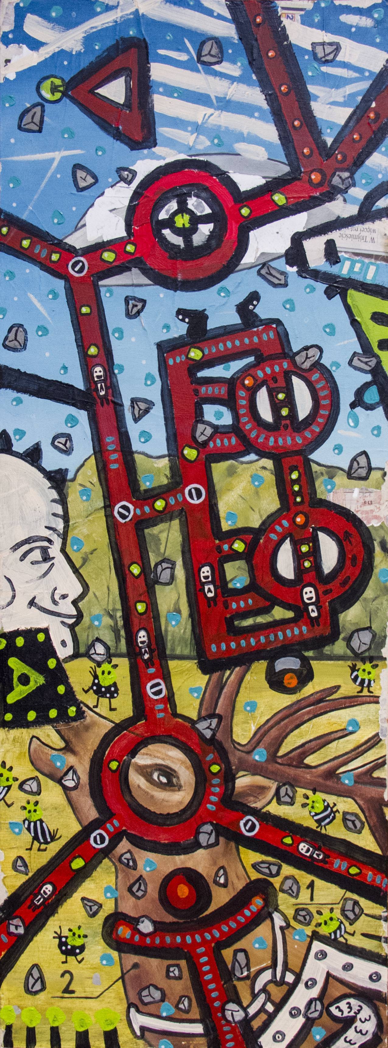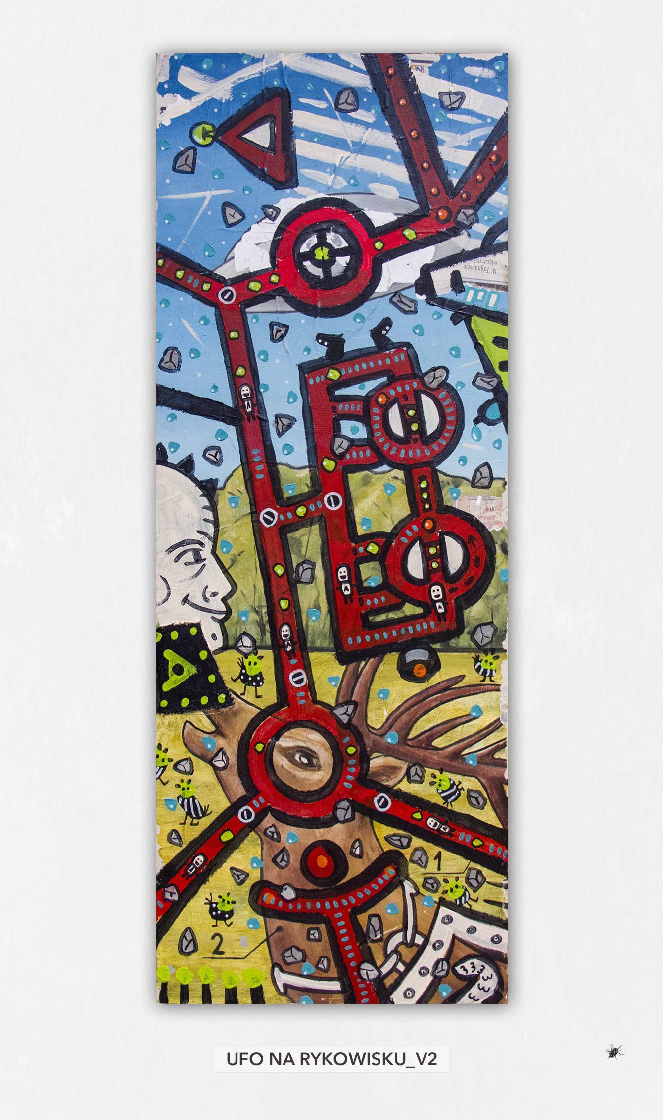 Obraz zatytułowany "UFO na Rykowisku_V2" jest prawdziwą eksplozją kolorów i form. Dominują tutaj niebieskie i czerwone tony, otaczające tajemnicze struktury, które unoszą się na tle chaotycznie rozrzuconych kształtów. Jest tu trochę jakby surrealizm, który wciąga w inny świat. W centrum widzimy intrygujące, czerwone linie tworzące geometryczny labirynt, przypominający kręgi lądujących statków kosmicznych. Atmosfera dzieła jest pełna energii i napięcia. Jakby coś niezwykłego miało się zaraz wydarzyć. Mamy tu połączenie futurystycznego designu z dziecinną wyobraźnią. Artysta wykorzystuje odważną kreskę i intensywne barwy, co nadaje obrazowi dynamiki i życia. Techniki zastosowane w obrazie sprawiają wrażenie, jakby malarz spontanicznie przelał na płótno swoje najśmielsze wizje. Wpatrując się w obraz, można poczuć nutę tajemnicy i trochę humoru. Dzieciak powiedziałby: "To kosmici bawią się w chowanego z wielkim jeleniem!" Praca wywołuje mieszankę zdumienia i ciekawości, otwierając przed odbiorcą drzwi do nieznanego. A może nawet i do innego wymiaru? Czuć tu vibe jakiegoś poważnego sci-fi. Jest to dzieło, które zachęca do odkrywania, przyciąga i nie pozwala o sobie zapomnieć.