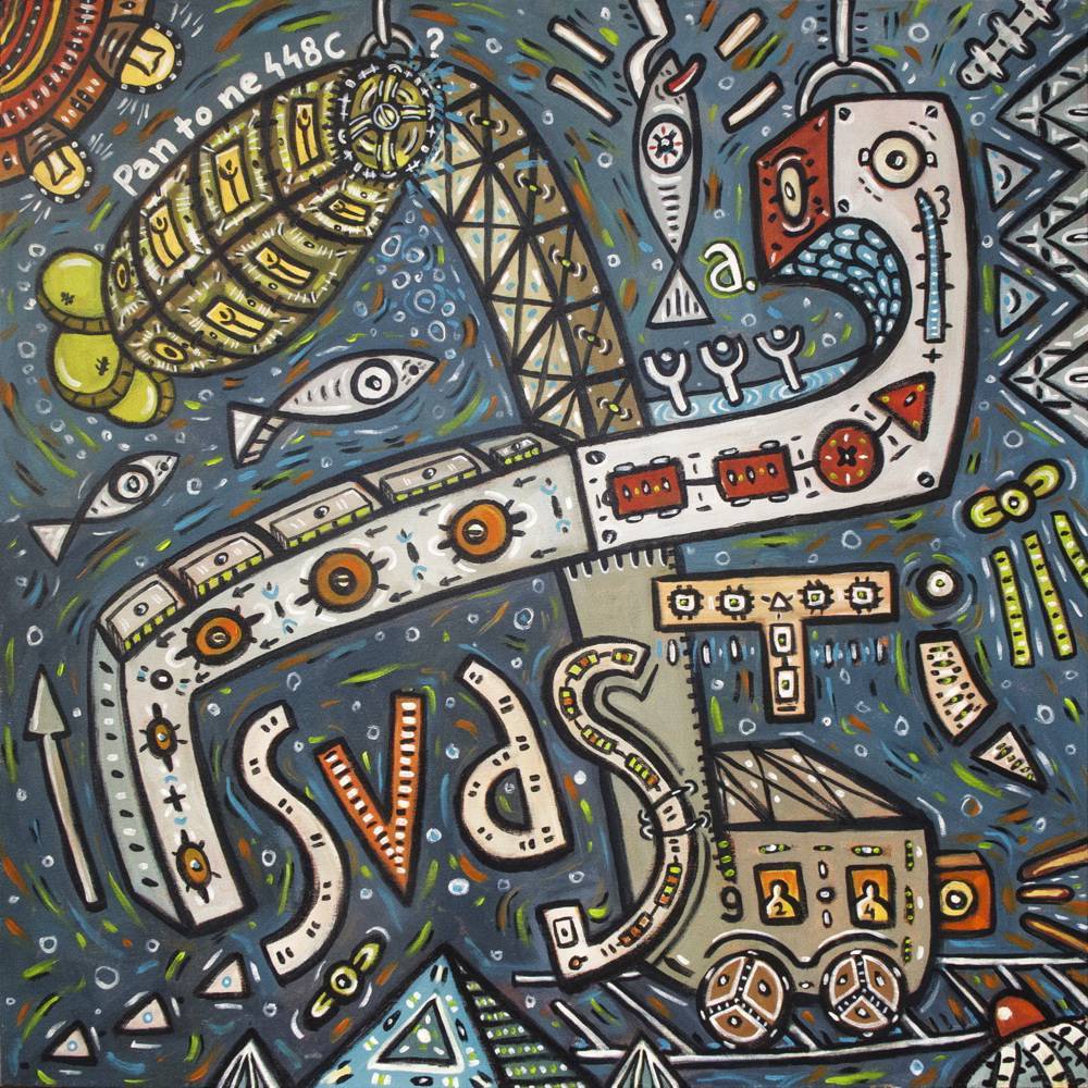 Ooo, co za obraz! Gdzie się zaczyna, a gdzie kończy, nikt nie wie. Kolory są żywe, jak tęcza po burzy – dużo niebieskiego, żółtego i zielonego, ale wszystko w takim lekko przytłumionym tonie. Widzisz te kształty? Takie ząbki, kółeczka, esy-floresy. Kompozycja pełna chaosu, trochę jak gdyby ktoś posklejał kawałki różnych rzeczy w jedną całość. Obraz emanuje energią, ale w pewien sposób wydaje się spokojny – jakby to było dynamiczne, ale jednak w swoim rytmie. Atmosfera jest tajemnicza, jak zagadka, którą chciałoby się rozwiązać. Pomieszanie nowoczesności z jakąś starą techniką. Wygląda to trochę jak połączenie graffiti z ludowym wzornictwem. Techniki? Hm, tu widać kreskę, jakby malowane szybko, energicznie. A jednak z dbałością o szczegół. To jakby artysta bawił się konwencjami i łamał zasady. Na przykład: "Co to za zagadkowe puzzle?". Może wywoływać w odbiorcy poczucie zaskoczenia, fascynacji, a może i odrobinę dziwnego spokoju. Patrząc na to dzieło, czuję pragnienie odkrycia czegoś nowego w codzienności. Emanujący "funk". Czuję, jakby obraz mówił: "Zatrzymaj się na chwilę, zrozum coś". "Mamo, ale tu jest dużo rybek!" – krzyknęło dziecko. Właśnie ten element dziecięcej radości i prostoty może być jednym z kluczy do zrozumienia tego obrazu.