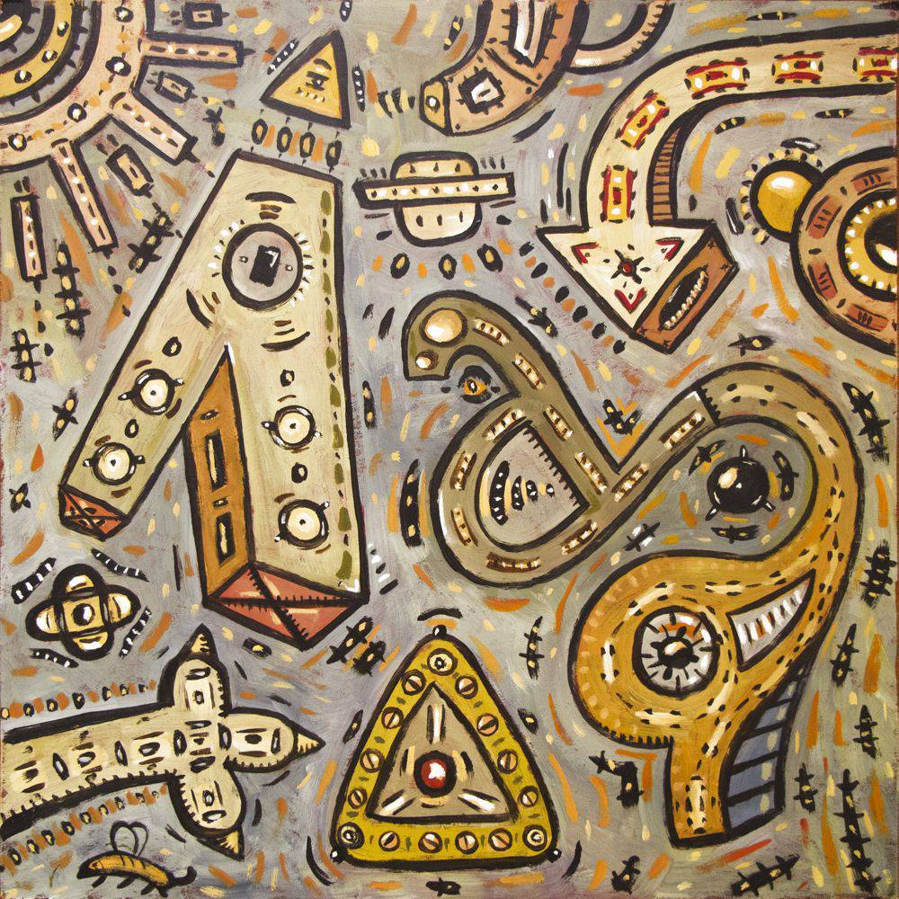 Obraz przyciąga wzrok dynamiczną kompozycją pełną zaokrąglonych i kanciastych kształtów, a także intensywną paletą kolorystyczną. Dominują tu odcienie beżu, brązu i ochry, przełamane czarnymi konturami, które nadają elementom wyrazistość. Na tle szarości widać liczne, drobne detale przypominające hieroglify lub znaki z odległej galaktyki. Coś, jakby kosmiczna mozaika. Atmosfera jest pełna energii, niemal czuć ruch i pulsowanie. Artysta postawił na abstrakcję z nutą surrealizmu, łącząc w swoim dziele różnorodne techniki: od wyrazistego konturu po subtelne cieniowanie. Wydaje się, że każde pociągnięcie pędzla jest tu przemyślane, choć na pierwszy rzut oka może sprawiać wrażenie chaosu. U odbiorcy obraz może wywołać mieszankę emocji: od ciekawości po zamyślenie. „To wygląda jak zabawkowe UFO!” – powiedziałoby dziecko. Interpretacja jest dowolna. Czy to labirynt czy mapa? A może zbiór symboli? Jest tu coś z dzieła science fiction, a cały obraz emanuje aurą odkrywania. Ale wiecie co, to prawdziwie „out of this world” experience. Zachwyt nad kunsztem wykonania splata się z chęcią poszukiwania znaczeń. To taki obraz, który mówi do ciebie – jeśli tylko chcesz słuchać.