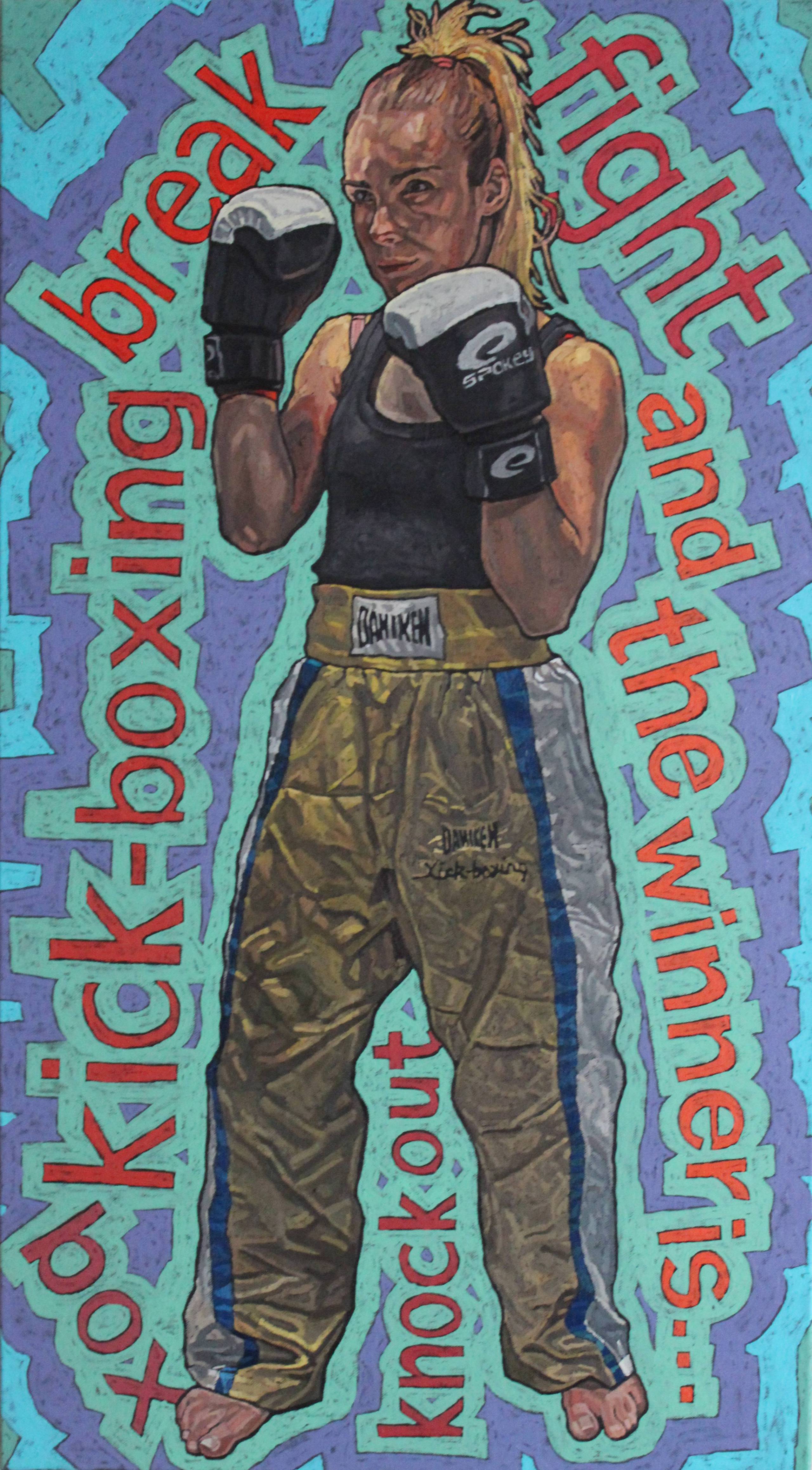 Na obrazie widzimy dynamiczną kompozycję pełną energii i zapału. Centralną postać stanowi kobieta gotowa do walki, ubrana w luźne, złote spodnie i czarny top. Jej postura emanuje pewnością siebie, a wyraz twarzy mówi "jestem gotowa na wszystko". W tle tętnią jaskrawe kolory — zielenie, błękity i fiolet, które wprowadzają niemały "wow" faktor. Obraz jest pełen gry kontrastów, zarówno kolorystycznych, jak i emocjonalnych. Wrażenie, jakie pozostawia ten obraz, to mieszanka napięcia i determinacji. Jakbyś miał za chwilę usłyszeć gong zapowiadający początek starcia. Technika, z której korzysta artysta, jest śmiała i bezkompromisowa. Grube pociągnięcia pędzla nadają całości niemal komiksowy charakter, a napisy otaczające postać mają w sobie coś z graffiti. Break, fight, knockout — te słowa nasuwają się od razu jak echo wewnętrznej walki. Widz może poczuć przypływ adrenaliny i chęć działania. Dla dziecka obraz ten mógłby oznaczać, że "dziewczyna zaraz wygra i dostanie medal". Ale dla mnie? To symbol siły i niezłomności w starciu z przeciwnościami. No cóż, artysta nie bawił się w subtelności, zamiast tego sięgnął po całą paletę emocji, dając nam prawdziwą "power" wizję na płótnie.