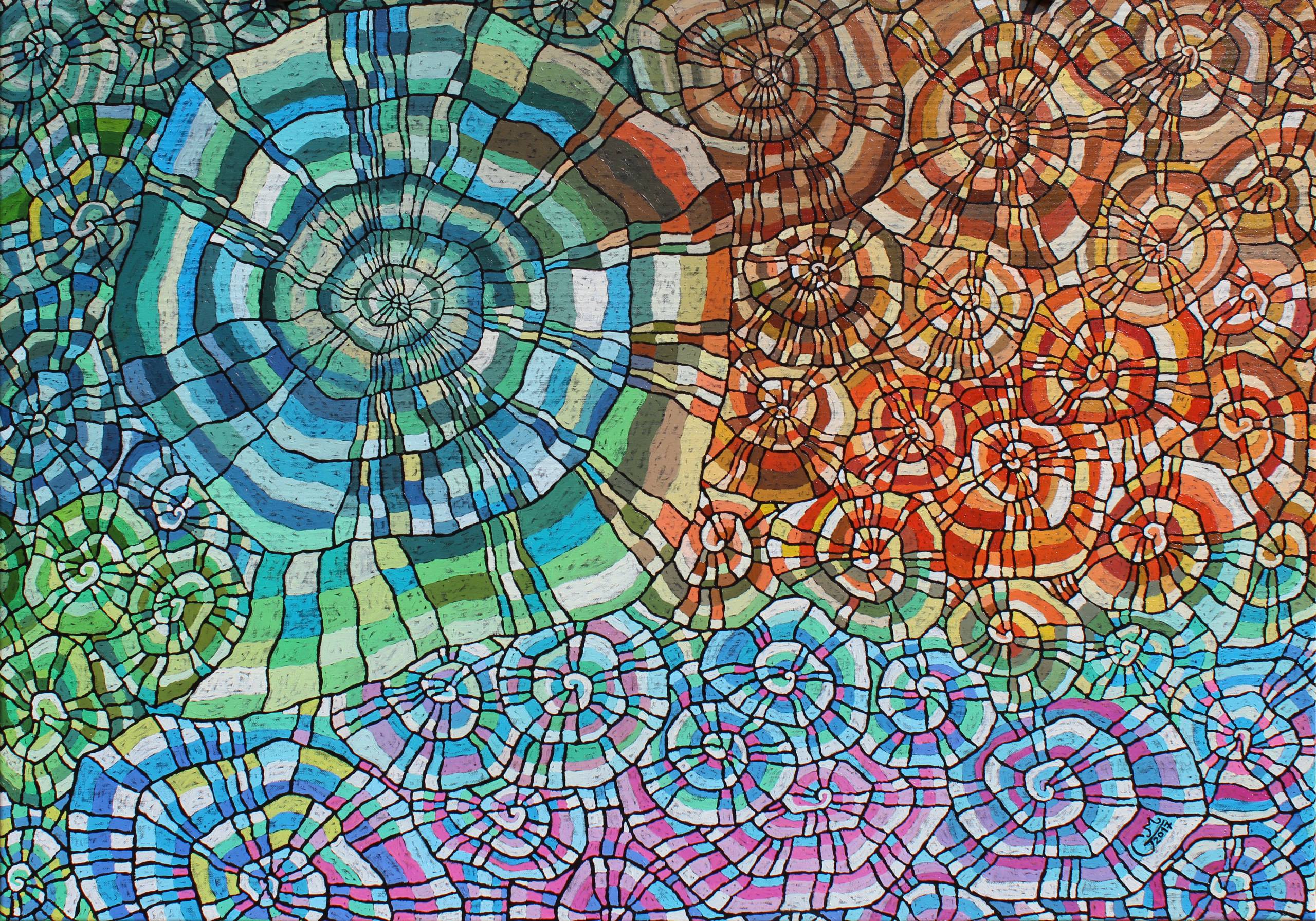 Choć obraz przypisałem do kategorii "abstrakcje", to jednak nie jest on pracą nieprzedstawiającą. Wyraźne bowiem odniosłem się w nim do spiralnych skamielin, znanych z różnego typu wykopalisk. Co więcej, moją ideą przy tworzeniu tego obrazu, było pokazanie procesu przemiany tych biologicznych form w skamieniałości. Proces ten nazywa się fosylizacją. To, że zobrazowanie dynamiki tego zjawiska przynależeć może raczej do animacji, spowodowało, że obraz ociera się o abstrakcję.