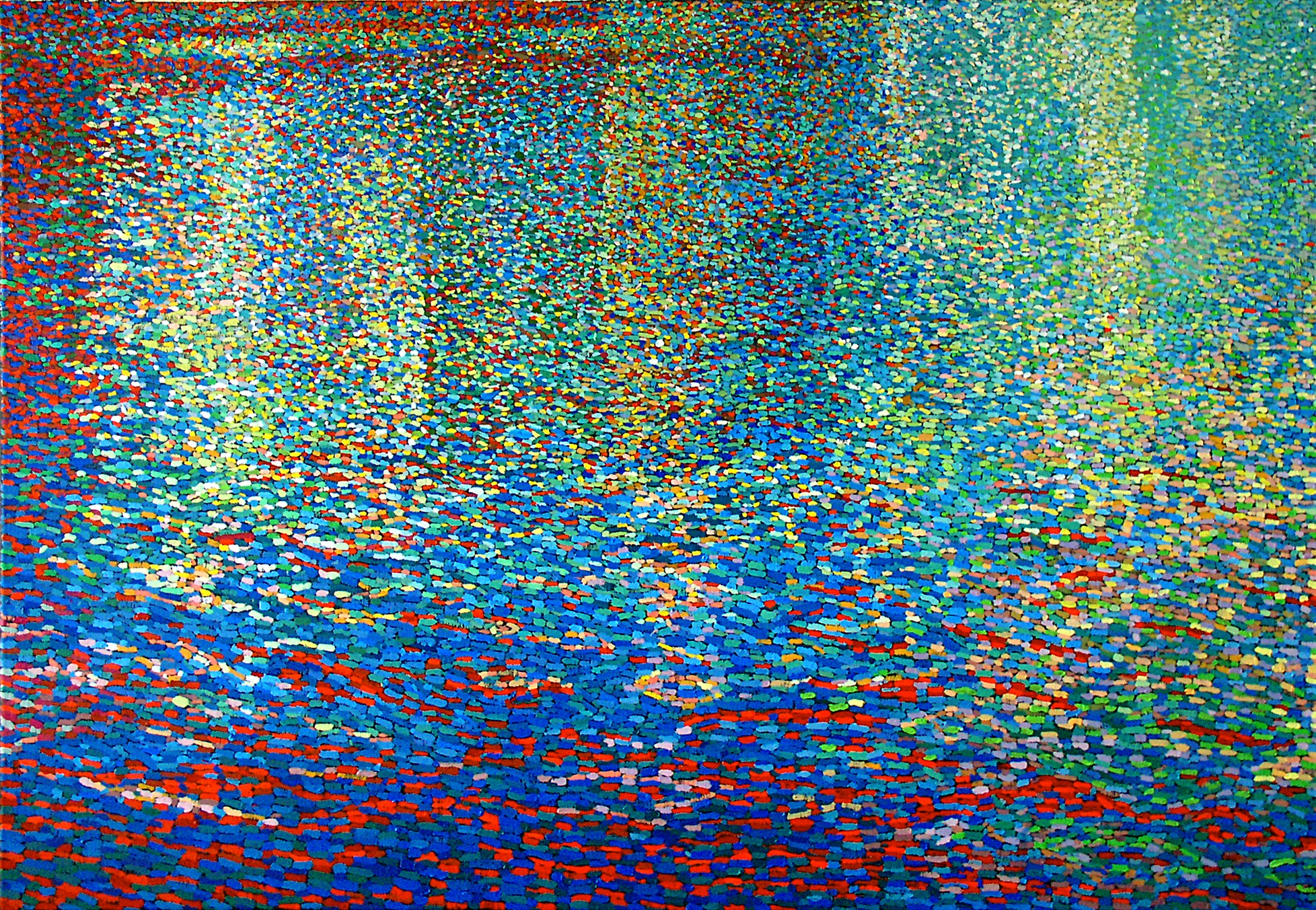 Obraz emanuje eksplozją kolorów. Dominują tutaj intensywne niebieskie i zielone tony, przeplatające się z ciepłymi barwami czerwieni i pomarańczy. Kompozycja przedstawia migoczące światło na wodzie, co nadaje dziełu dynamiczny, niemalże pulsujący charakter. Artysta zastosował technikę pointylizmu, gdzie każda kropeczka to osobna nuta w tej kolorystycznej symfonii. To dzieło emanuje spokojem, ale jednocześnie kryje w sobie ogrom energii. Look closely, a zobaczysz odbicie nieba na toni wody. Nastrój jest radosny, jakby ktoś zanurzył się w letnie popołudnie nad jeziorem. Patrząc na obraz, można poczuć lekki dreszczyk emocji, jak przed nowym odkryciem. Wzrok błądzi, próbując uchwycić ulotne kształty. Styl artysty łączy w sobie precyzję i emocję, co sprawia, że każdy widz może znaleźć tu coś dla siebie. Wyobraź sobie, że to twój własny secret garden, pełen niekończącej się świeżości i optymizmu. Jak mówiłby 7-latek: "Te kolory są jak cukierki". Obraz jest prawdziwym zaproszeniem do eksploracji, nie tylko wzrokowej, ale i emocjonalnej.