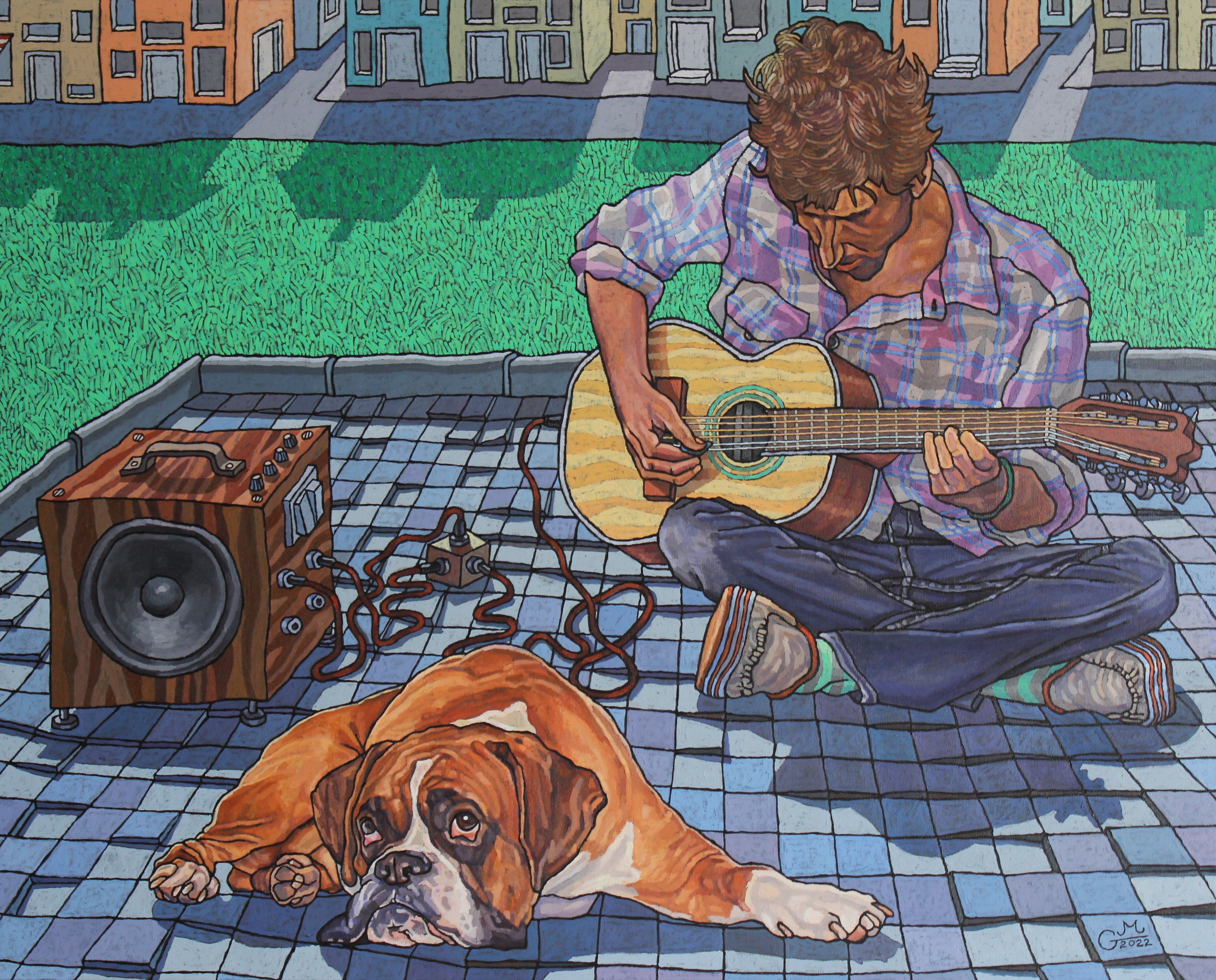 Na obrazie widzimy młodego mężczyznę w koszuli w kratę, siedzącego na sfatygowanej kostce brukowej u z gitarą w rękach. To scena pełna koloru, z ciepłymi odcieniami brązu, zielenią trawników i pastelowymi budynkami w tle. Przed tym grajkiem ulicznym leży pies, który wygląda na cokolwiek znudzonego. Obok stoi mały wzmacniacz, co dodaje charakteru tej relaksującej scenie. Atmosfera obrazu jest spokojna i prawie możemy usłyszeć dźwięki gitary w promieniach popołudniowego słońca. Artysta używa mocnych konturów i intensywnych kolorów. Można odnieść wrażenie, że mężczyzna jest zanurzony w świecie muzyki, podczas gdy pies spokojnie czuwa obok. Dla dziecka to obrazek pokazujący, jak przyjaciele mogą zawsze być razem i cieszyć się chwilą. „Ja też chce mieć takiego przyjaciela - psa!” mogłoby powiedzieć 7-letnie dziecko. Obraz wywołuje uczucia spokoju i ciepła, a jednocześnie inspiruje do kreatywności. Gdy patrzę na tę scenę, myślę o młodzieżowych marzeniach i prostych przyjemnościach życia. The harmony between man and animai - it's inspiring! To dzieło, które przypomina, że warto znaleźć chwilę wytchnienia i delektować się nią.