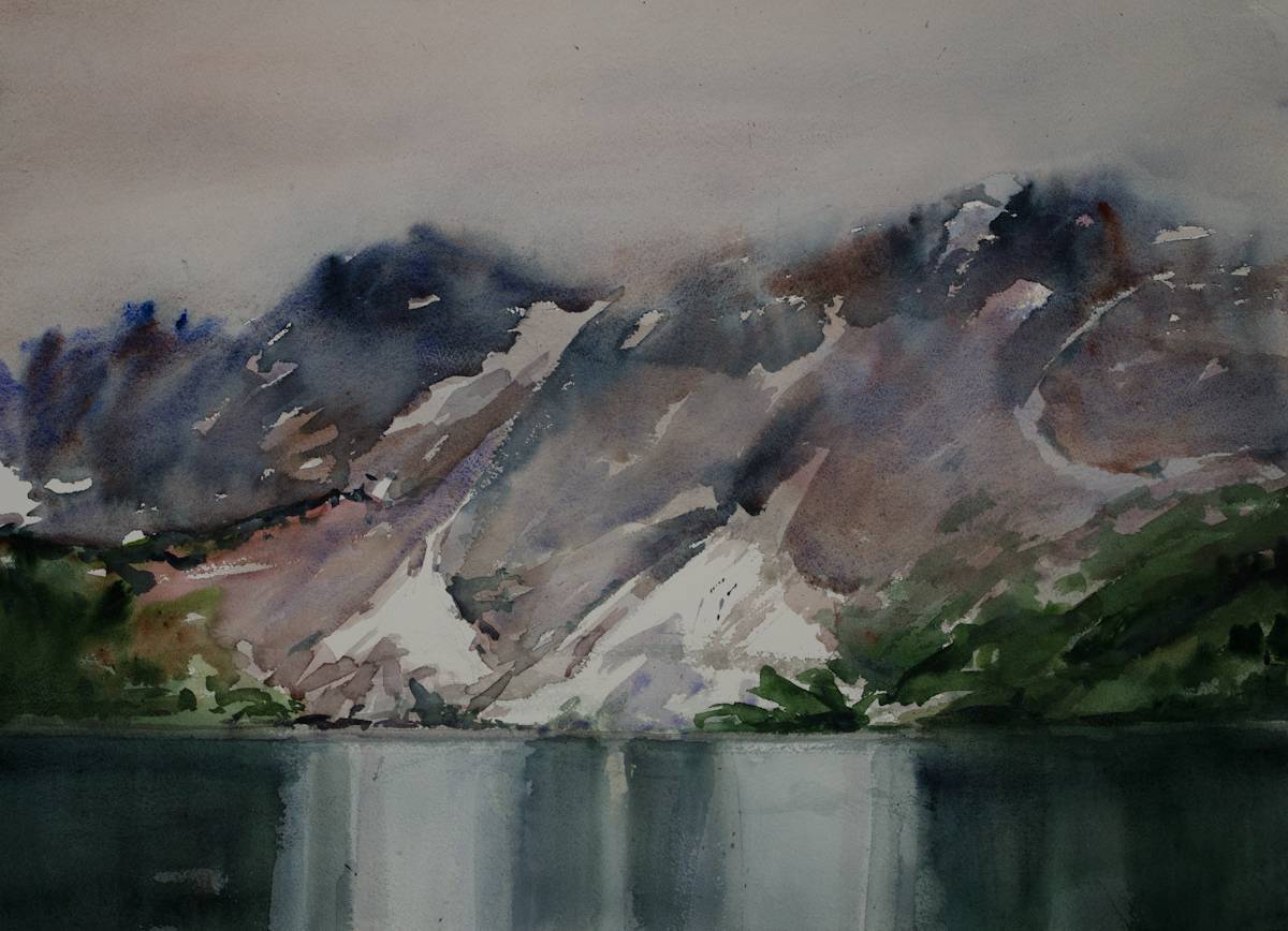 Obraz przedstawia malowniczy krajobraz górski odbijający się w spokojnych wodach jeziora. Dominują stonowane kolory - odcienie szarości, granatu i zieleni - które tworzą harmonijną kompozycję. Góry wydają się być delikatnie owinięte mgłą, co nadaje całości tajemniczy, nieco melancholijny nastrój. Mimo że niebo jest zachmurzone, woda spokojnie odbija ten magiczny krajobraz. Technika akwareli użyta przez artystę dodaje subtelności i lekkości scenie, a miękkie pociągnięcia pędzla tworzą efekt delikatnego ruchu przyrody. Obraz wywołuje emocje spokoju i zadumy. Można niemal usłyszeć szum wiatru i delikatne fale jeziora. Co ciekawe, prostota użytych form nie pozbawia obrazu głębii, a wręcz przeciwnie, zachęca do refleksji. Niesamowite jest, jak artysta potrafił oddać esencję natury w tak minimalistyczny sposób. I wtedy pomyślałem sobie: wow, takie widoki to prawdziwe "breathtaking" experience. Całość stylu może kojarzyć się z impresjonizmem, gdzie liczą się wrażenia i emocje, a nie dosłowność. Dla siedmiolatka to wszystko może wyglądać jak jakieś magiczne miejsce z bajki. Niesamowite jak sztuka potrafi poruszyć najgłębsze pokłady naszej wyobraźni. Wiesz co? Takie obrazy sprawiają, że chcę ruszyć w góry i sam to wszystko zobaczyć.
