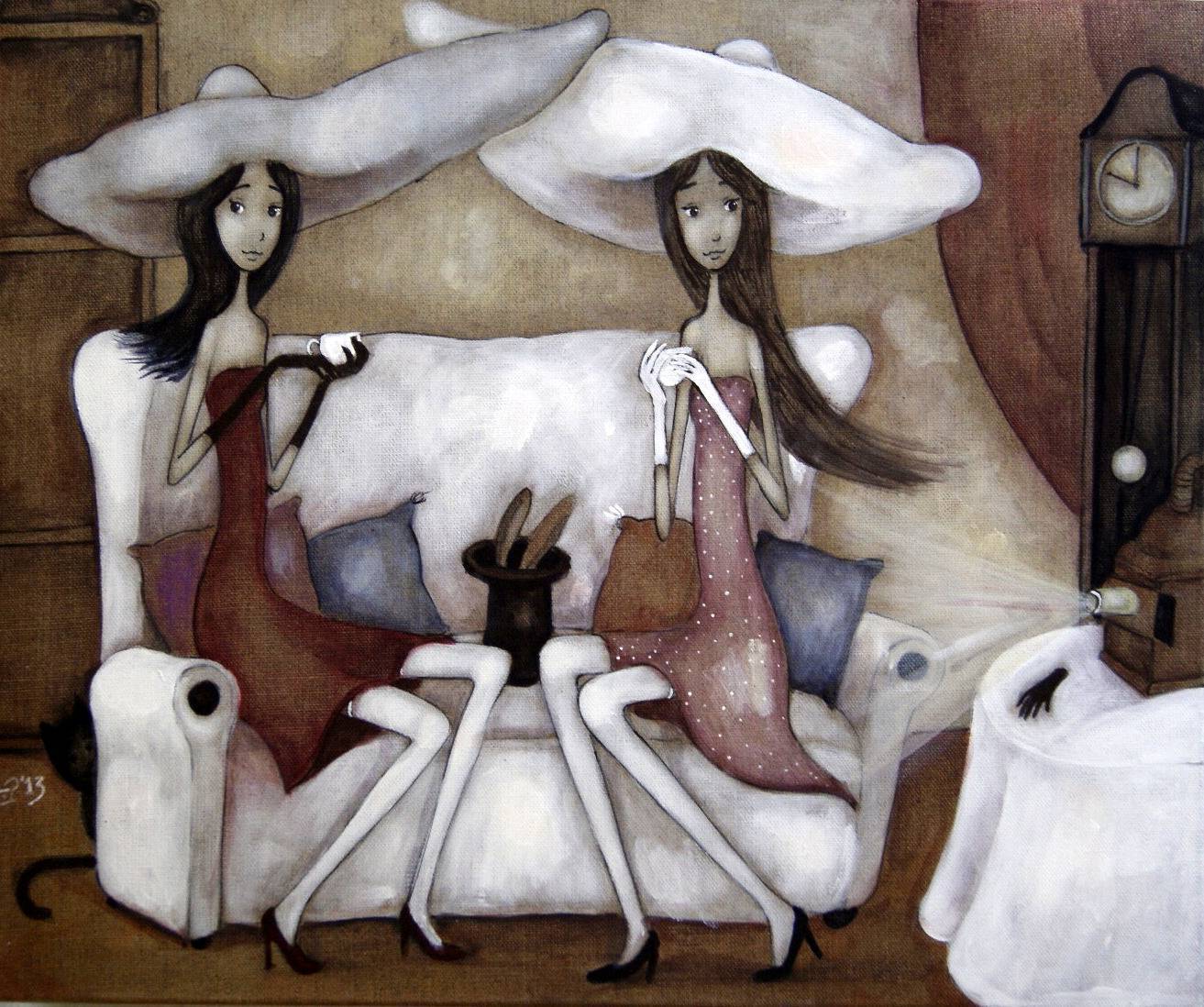 Obraz przedstawia dwie postacie siedzące na kanapie, każda w dużym, białym kapeluszu, które wyglądają, jakby chciały zakryć cały świat. Ich długie, smukłe sylwetki i subtelnie zarysowane twarze przyciągają wzrok. Kolory są stonowane, dominują brązy i beże, tworząc spokojną, niemal senna atmosferę. Kompozycja jest dobrze wyważona, z delikatną asymetrią, która dodaje dynamiki. Artysta posłużył się prostymi liniami i dużymi, płaskimi plamami koloru. Styl jest nieco surrealistyczny, przypominający prace z nurtu art déco. Patrząc na obraz, można poczuć się jak w jakiejś magicznej krainie, gdzie czas biegnie wolniej. Trochę jak w bajce, w której czekamy na rozwój dziwnych wydarzeń. Dzieło wywołuje mieszankę ciekawości i nostalgii. Może przypominać nam chwilę ciszy przed burzą lub moment refleksji przed podjęciem decyzji. Ma także w sobie element "mystery" — co te postacie myślą? Co czują przez cienką warstwę chłodu? Obraz może budzić w widzu wrażenie lekkiej melancholii, przypominając o chwilach, kiedy wpatrywaliśmy się w nic, zanurzeni we własnych myślach. Mój brat powiedziałby: „A czemu oni mają takie duże kapelusze?” To małe naruszenie formalności tekstu. Każdy widz może znaleźć swoje własne odbicie w tej tajemniczej kompozycji.