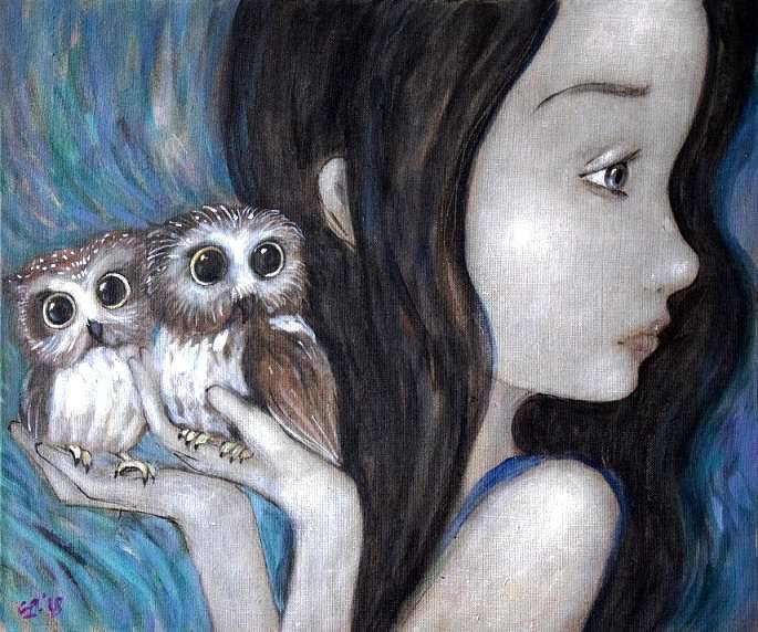 Na obrazie widzimy dziewczynkę o długich, ciemnych włosach, która z fascynacją patrzy w stronę dwóch małych sów. Jej twarz jest subtelna i eteryczna, a duże, wyraziste oczy zdają się opowiadać własną historię. Urocze sowy z wielkimi oczami spoglądają ufnie, wydają się kruche i delikatne jak bańki mydlane. Delikatne odcienie błękitu i zieleni tworzą miękkie tło, które wydobywa postacie na pierwszy plan. Kolory płynnie się przenikają, dodając kompozycji harmonii i spokoju. Atmosfera obrazu jest nieco baśniowa, magiczna wręcz, co sprawia, że widz zatrzymuje się, by zatracić się w tej chwili. Styl artystyczny łączy w sobie realizm z nutą fantazji, a delikatne pociągnięcia pędzla sugerują lekko abstrakcyjny charakter. Technika zdaje się być precyzyjna, choć pełna swobody. Odbiorca może poczuć się jak w zaczarowanym świecie, gdzie prostota codziennych chwil zyskuje na znaczeniu. Dzieci mogą powiedzieć: Dziewczynka przytula sowy. Tak, po prostu. Obraz ten może budzić uczucia spokojnej radości, niesie ze sobą takie ciepło, które czasem trudno uchwycić. Jest coś fascynującego w tej nieruchomej scenie, co przypomina mi letnie wieczory spędzone na obserwacji przyrody. A subtle magic jakiejś chwili. To po prostu piękne. Chciałabyś też mieć takie sowy do przytulania?