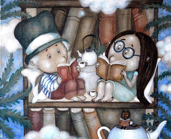 Obraz przedstawia uroczy świat, pełen książek i marzeń. Dwoje dzieci siedzi wśród ogromnych tomów, które otaczają ich jak ochronna forteca. Dominują spokojne odcienie brązu, zieleni i błękitu, które nadają całej scenie przytulności. Książki wyglądają jak stare, z pożółkłymi stronami, a dwoje małych bohaterów głęboko zanurza się w lekturze. Towarzyszy im mały czajniczek i filiżanki, tworząc sielankowy klimat popołudniowej herbatki. Atmosfera obrazu jest magiczna, jakby zaczerpnięta z dziecięcych snów. Artysta zastosował technikę akwareli, nadając wszystkiemu delikatny, niemalże lekki wygląd. Postacie są karykaturalnie przerysowane, z wielkimi oczami i proporcjami, co dodaje całości humorystycznego charakteru. Jest tu coś z nostalgii za dzieciństwem. Obraz przypomina mi popołudnia spędzone na czytaniu książek ukrytym w kocach. "Look how cute they are!", można by powiedzieć, patrząc na tę scenę. Patrząc na te dzieci, można poczuć spokój, ale także zapalić się do własnych przygód literackich. Chyba każdemu dorosłemu serce się raduje na taki widok. A to świat, gdzie wszystko jest możliwe. "Chciałem też tak kiedyś czytać!" - mówiłby 7-latek zauroczony tą sceną. Ten obraz jest jak mała, magiczna podróż w przeszłość, do czasów, kiedy każda książka skrywała tajemnice i przygody warte przeżycia.