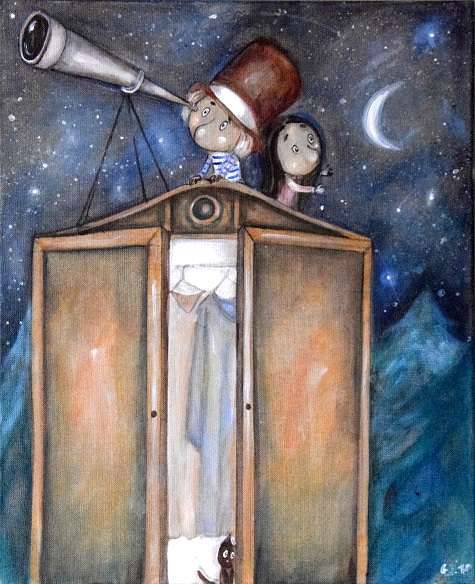 Na obrazie widzimy dwa dzieciaki siedzące na szczycie starej, drewnianej szafy, spoglądające przez teleskop w niebo, pełne migoczących gwiazd. Kolory nocnego nieba - głębokie granaty i tajemnicze czernie - tworzą magiczną atmosferę, która przyciąga wzrok. Zza szafy wychyla się coś, co przypomina kotka, może to jakaś niespodzianka? Kształty są lekko zdeformowane, jak w dziecięcych rysunkach, co dodaje uroku i czyni kompozycję lekką i subtelną. Obraz jest pełen ciepłej aury przygody i ciekawości, które można niemal dotknąć. Artysta zastosował technikę delikatnych pociągnięć pędzla, co nadaje dziełu miękkości. Ach, te nocne marzenia dzieciaków, które eksplorują kosmos z dachu szafy! A moon wygląda jak z bajki, prawda? Obraz może wywołać uczucia nostalgii i pragnienia przygód, wspomnień z dzieciństwa o skradzionych chwilach z przyjaciółmi. Wow, te dzieciaki naprawdę mają fun. Patrząc na to, można zatęsknić za czasami, kiedy wszystko wydawało się możliwe i tajemnicze.