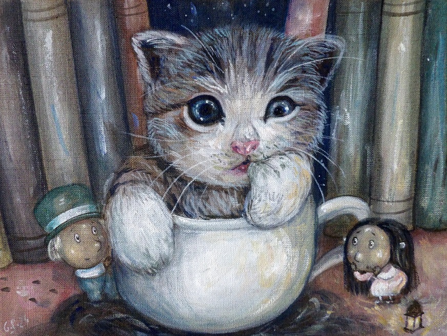 Ten obrazek zdecydowanie przyciąga wzrok. Centralnym punktem kompozycji jest uroczy kotek, siedzący w kubku. Jego wielkie, błyszczące oczy sprawiają, że nie można odwrócić wzroku. Kolory są stonowane, dominują odcienie brązu i szarości, ale przełamane są wyrazistym różem noska kota. Atmosfera obrazu jest magiczna i lekko surrealistyczna. Kot wydaje się mieć osobowość, jakby był postacią z bajki. Obok kubka znajdują się dwie zabawne postacie, które dodają całości przyjemnej nuty tajemnicy. Jedna wygląda jak mała laleczka w zielonym kapeluszu, druga jak czarująca, miniaturowa postać. Artysta zastosował delikatne pociągnięcia pędzla, co nadaje obrazowi miękkości i subtelności. Technika jest szczegółowa, a jednocześnie nieco rozmyta, nadając mu dreamlike quality. Aż chce się wejść do tego świata. Można się poczuć jak dziecko, które właśnie odkrywa tajemnice zakamarków swojej wyobraźni. Patrząc na obraz, pojawia się uczucie ciepła i nostalgii. Przypomina dzieciństwo, beztroskę i chwile spędzone na wymyślaniu historii o małych zwierzakach. Taki kotek mógłby być doskonałym towarzyszem zabaw! A z tyłu widoczne są książki, co dodatkowo sugeruje bogaty, baśniowy świat, pełen nieodkrytych opowieści. „Chcę takiego kotka!” – mogłaby wykrzyczeć siedmioletnia dziewczynka, widząc ten obraz. To dzieło wywołuje uśmiech i sprawia, że świat wydaje się trochę milszy. Może to właśnie ten rodzaj sztuki, który na chwilę pozwala zapomnieć o codzienności.