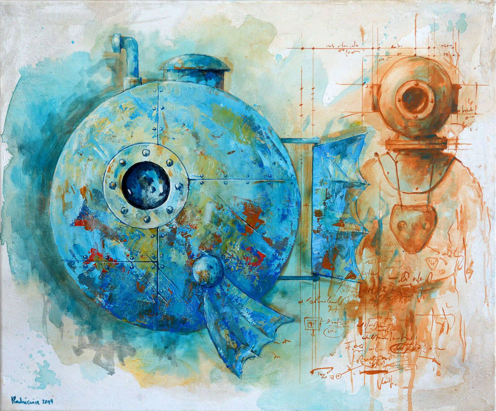 Obraz jest pełen intensywnych kolorów – dominują niebieskie, turkusowe odcienie, które przeplatają się z rdzawymi i pomarańczowymi fragmentami. Kompozycja składa się z okrągłych i geometrycznych kształtów, które przyciągają wzrok. Jedna z form przypomina starą maszynę lub podwodną kapsułę, a wokół niej jest mnóstwo detali i technicznych rysunków. Atmosfera dzieła jest tajemnicza, skłania do refleksji. Czujesz się jak odkrywca na nieznanym terenie, odkrywając zagadki przeszłości. Artysta zastosował technikę akwareli, mieszając plamy kolorów w delikatne gradienty, co nadaje lekkość i dynamiczność. Ten styl, łączący technikę watercolor z precyzyjnymi liniami, jest naprawdę captivating. Obraz wywołuje emocje związane z nostalgią i ciekawością – co to mogło być? Może to jakaś ukryta historia czy relikt przeszłości? Myślę o tym jak o zabawce sprzed lat, która teraz zyskuje nowe życie. "To wygląda jak wielka ryba kosmosowa!" – mógłby powiedzieć mały chłopiec. Fascynuje mnie, jak różnorodnie można interpretować ten obraz, każdy znajdzie coś innego.