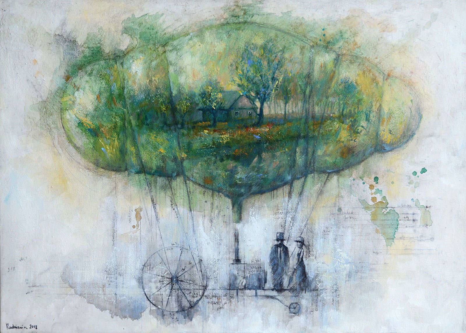 Obraz pełen jest kolorów i magii. Dominują tu różne odcienie zieleni przeplatane niebieskimi plamami i delikatnymi żółtymi akcentami. Na pierwszy rzut oka widzimy drzewo, które zdaje się unosić nad ziemią. Na dole postacie. Cóż za dziwaczna scena. Kompozycja jest oniryczna, miesza rzeczywistość z wyobraźnią, a wszystko to na tle delikatnych, kremowych odcieni. Atmosfera jest lekka, niemal eteryczna. Artysta zastosował delikatne pociągnięcia pędzlem, co nadaje pracy subtelności i ulotności. To tak, jakby cały świat został zamknięty w kapsule czasu. Obraz może wywoływać uczucie nostalgii, pragnienie ucieczki do krainy marzeń. Pojawiające się figury w dolnej części obrazu zdają się być poza czasem, jak goście z przeszłości lub przyszłości. Wow, ja też tak chcę polecieć! Technika zdaje się bazować na mieszance akwareli i ołówka, co tworzy efekt pastelowej delikatności. Podczas oglądania tego dzieła trudno nie poczuć spokoju i tajemnicy. The dream-like quality sprawia, że obraz długo zostaje w pamięci, skłaniając do refleksji nad tym, co jest rzeczywiste, a co tylko snem.