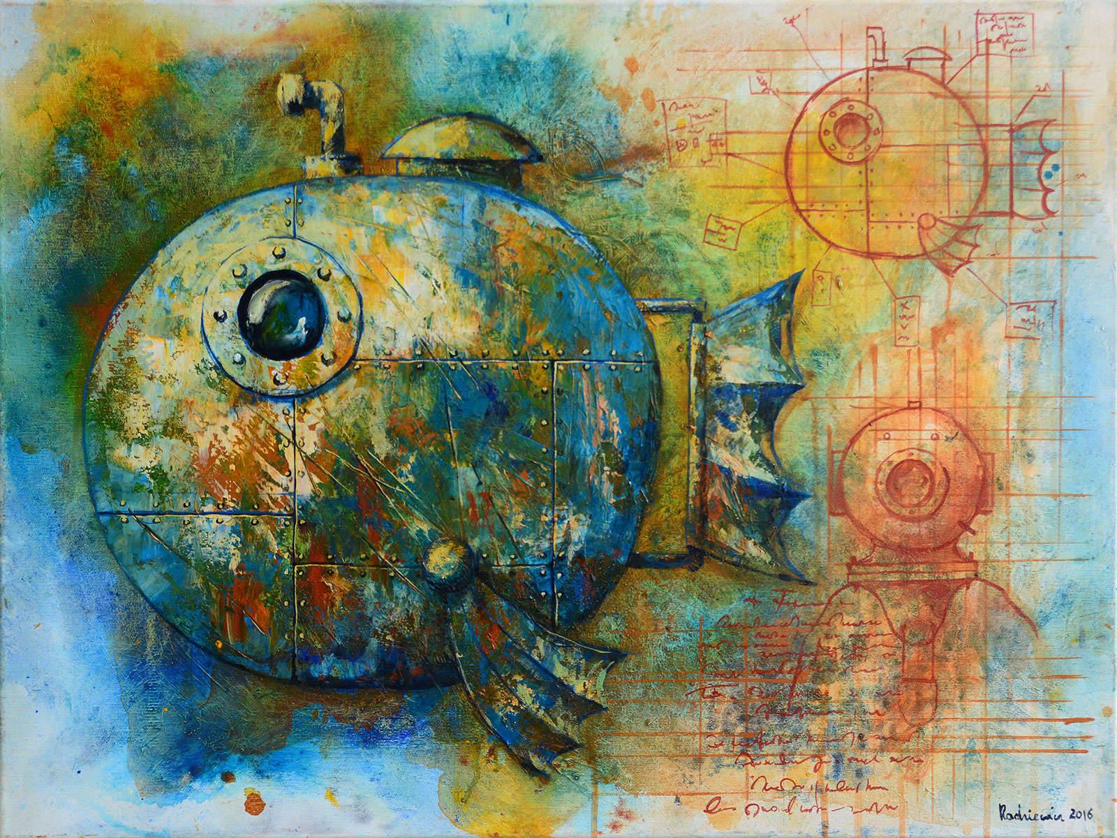 Obraz przyciąga wzrok swoimi żywymi kolorami - niebieskie i zielone odcienie przeplatają się z ciepłymi, rdza rezyduje na powierzchni stalowego okrętu. Wygląda to trochę jak sen o podwodnej podróży, gdzie inżynieria spotyka się z fantazją. Kształty zaokrąglone, metalowe, sugerują maszynę, może łódź podwodną, o nieregularnych liniach, która zdaje się płynąć w gęstym oceanie. Na jednej stronie obrazu jest jakby projekt techniczny, rysunek techniczny, co dodaje nowoczesnego accent. Atmosfera jest pełna tajemnicy, jakbyśmy patrzyli na marzenie wynalazcy. Styl artysty jest śmiały, łączy technikę klasycznego malarstwa z odrobiną współczesnego ekspresjonizmu. Użycie tekstur daje poczucie głębi, jakby powierzchnia była pełna historii. Czuć nostalgiczną nutę - przypomina historie o morskich przygodach. Czy to nie fascynujące? Myślisz o kapitanie Nemo? Ja czuję tęsknotę za nieznanym, za odkrywaniem. To takie 'awesome'. Dzieciak mógłby powiedzieć: o, zobacz, podwodny statek! Patrząc na ten obraz, sam pragnę zanurzyć się w magiczny świat, skryty przed wzrokiem ciekawskich. Co skrywa się w głębinach? To pytanie samo się nasuwa.