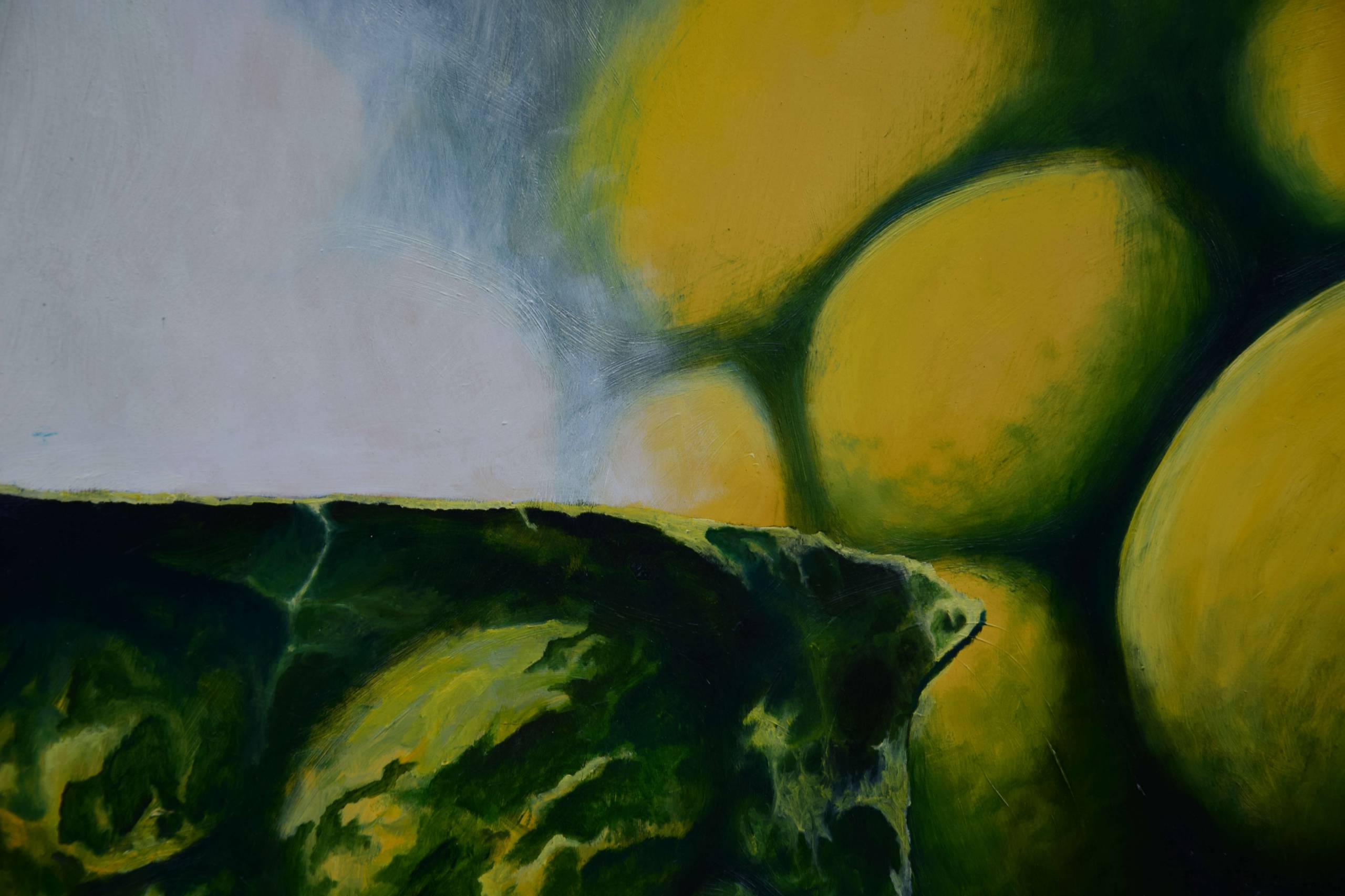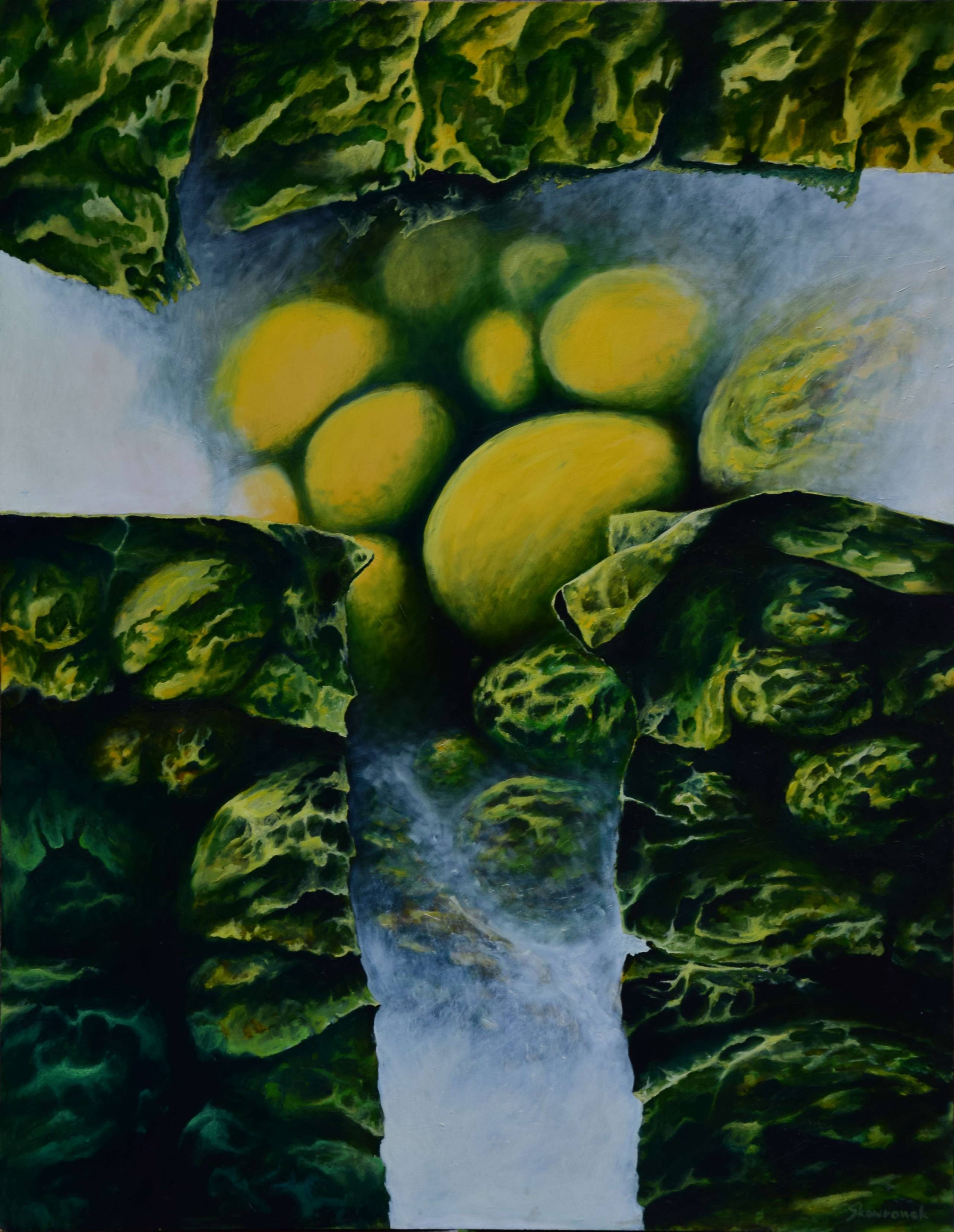 Obraz emanuje tajemniczością i spokojem. Dominują tu odcienie zieleni i zagadkowa żółć, które nadają mu niemal organiczny charakter. Liście, niczym rzeźbione w ciemnozielonym marmurze, otaczają centralną kompozycję składającą się z kulistych form, które zdają się delikatnie pulsować we mgle. Całość tworzy wrażenie, jakbyśmy zaglądali do wnętrza tajemniczego ogrodu lub podwodnego światu. Artysta wykorzystuje techniki, które przypominają bardziej malarstwo impresjonistyczne. Liście są miękkie, niemalże można je poczuć pod palcami, gdy przejeżdżamy wzrokiem po płótnie. Obraz jest trochę jak sen, w którym wszystko jest nieco rozmyte i pełne mylących form. A może to inny świat? W każdym razie, nie chce się stąd wracać do zwyczajności. Patrząc na ten obraz, możemy poczuć spokój, ale także nutkę niepokoju. Kuliste formy przywodzą na myśl jaja, co wzmaga poczucie początku, narodzin. Ale co się z nich wykluje? Myślę, że coś magicznego. For me, this painting is like a mystery waiting to be uncovered. "To taki las," powiedziałoby dziecko i miałoby rację, bo czyż to nie przypomina jakiejś zaczarowanej krainy z bajki? Czy to nie tam chciałbyś się zgubić na chwilę?