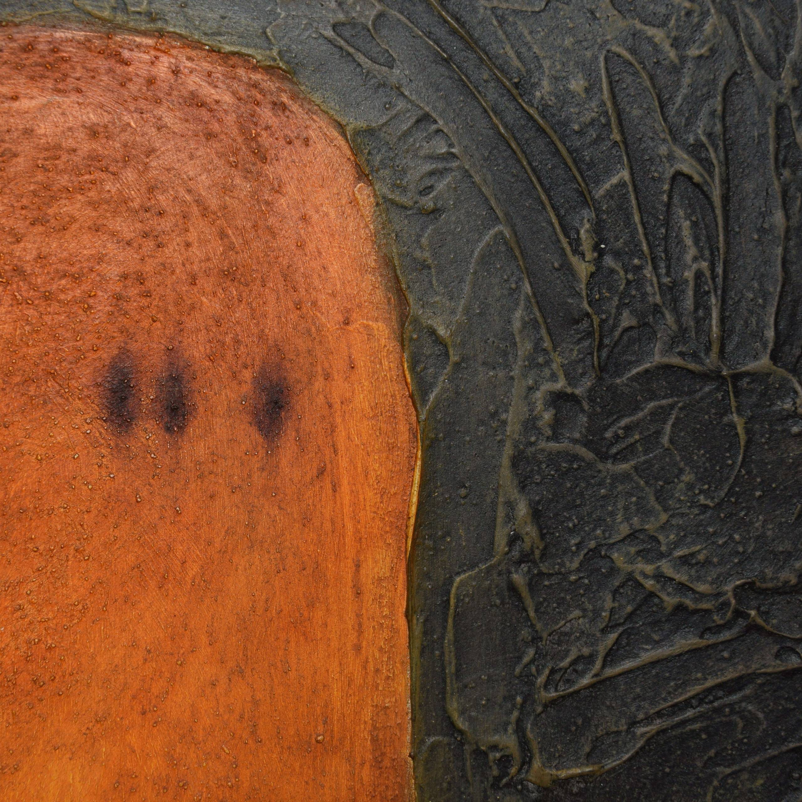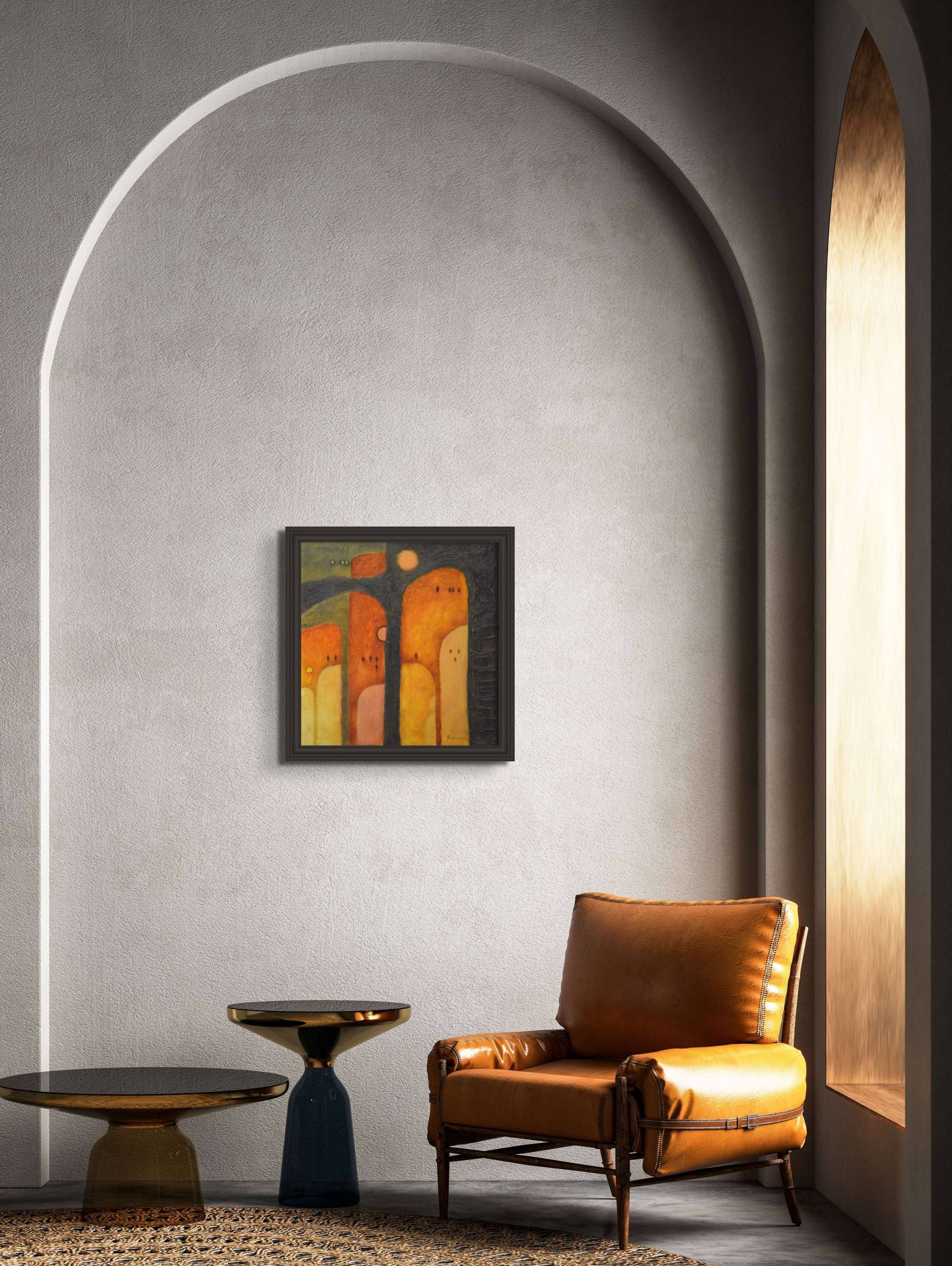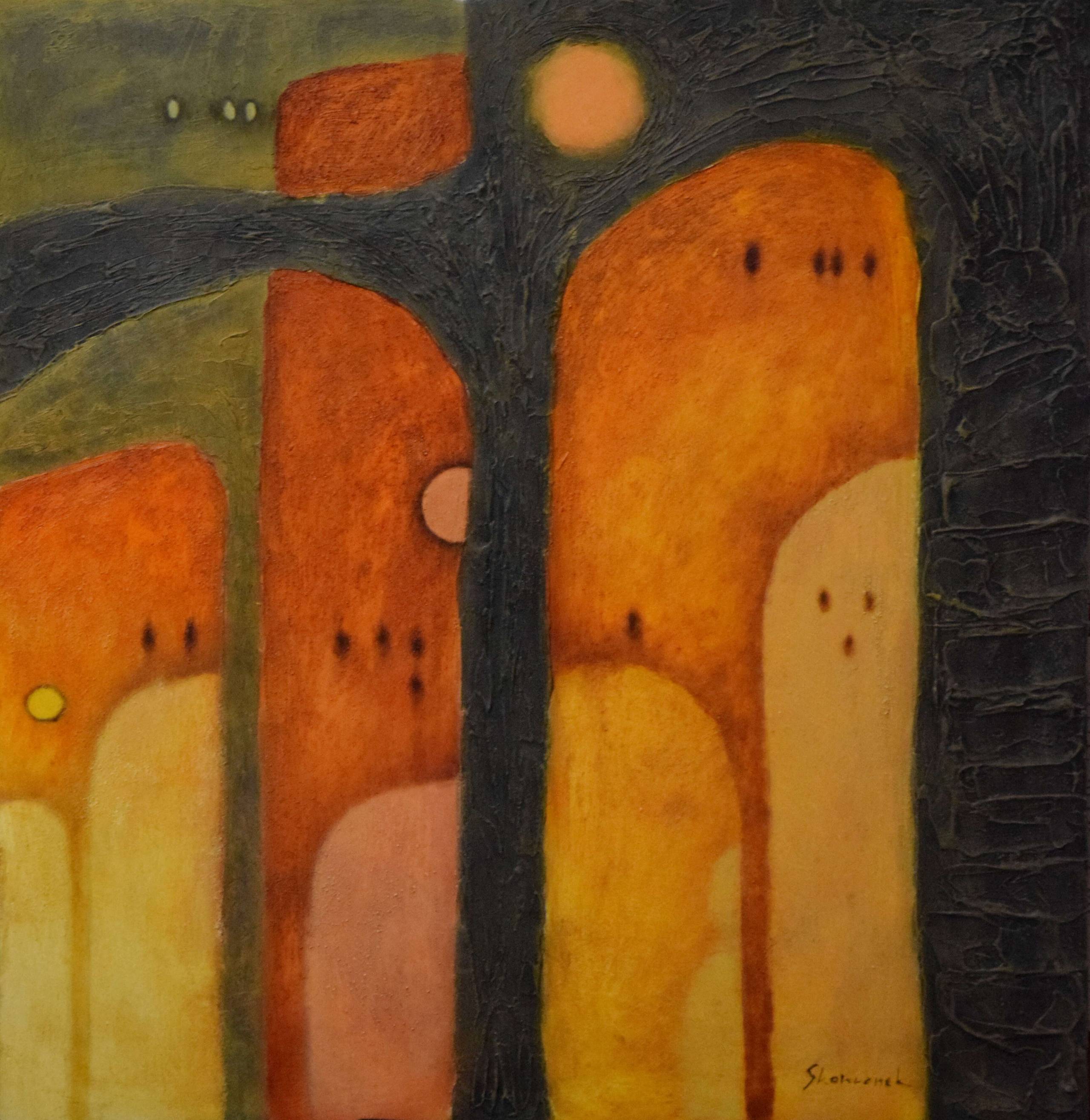 Obraz emanuje ciepłymi tonami pomarańczu, żółci i ciemnych szarości, tworząc złożoną, ale subtelnie harmonijną kompozycję. Kształty są organiczne, niemal eteryczne, przypominające sylwetki unoszące się w przestrzeni, jakby delikatnie zarysowane przez promienie zachodzącego słońca. Atmosfera tego dzieła jest tajemnicza, a zarazem pełna spokoju, jakby kryły się w niej niewypowiedziane historie. Artysta skorzystał z techniki impasto, co wzbogaca fakturę obrazu, nadając mu głębię i dynamikę. Prosty, ale wyrazisty język wizualny robi ogromne wrażenie. To trochę jak wejście do innego świata. Widz może poczuć się jak eksplorator odkrywający nieznane krainy pełne emocji i magicznych tajemnic. Może tykajacy zegar zauważy? Gdy patrzę na te niezwykle kształty, czuje się, jakbym sam był częścią tej onirycznej przestrzeni. Jeden element przyciąga uwagę – małe kropki, może gwiazdy, może oczy – które dodają obrazu nieco dreamy quality. Każdy z nas spojrzy na to dzieło z innym bagażem emocji. Z jednej strony coś nieuchwytnego i niepokojącego, z drugiej – poczucie wewnętrznego spokoju i wyciszenia.
