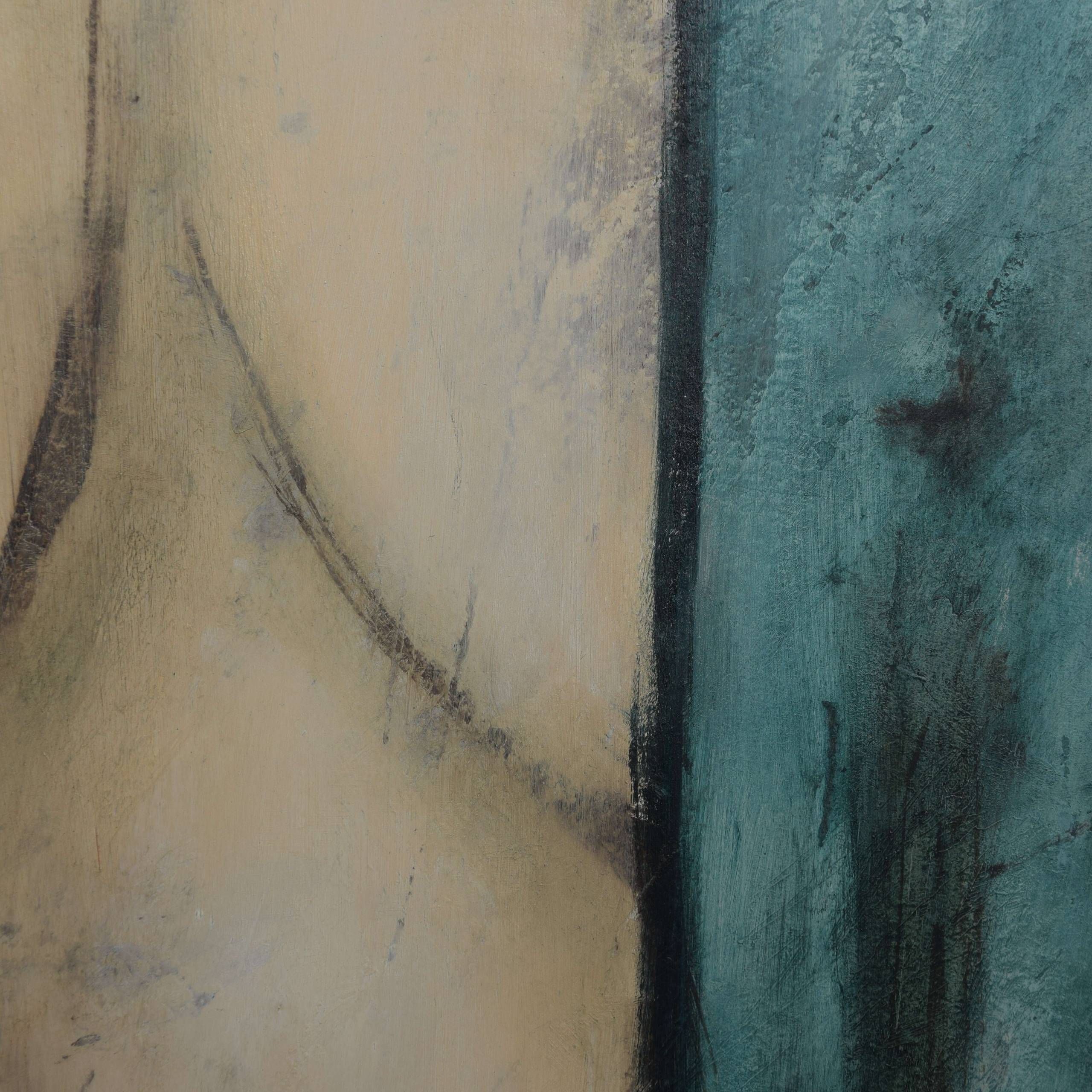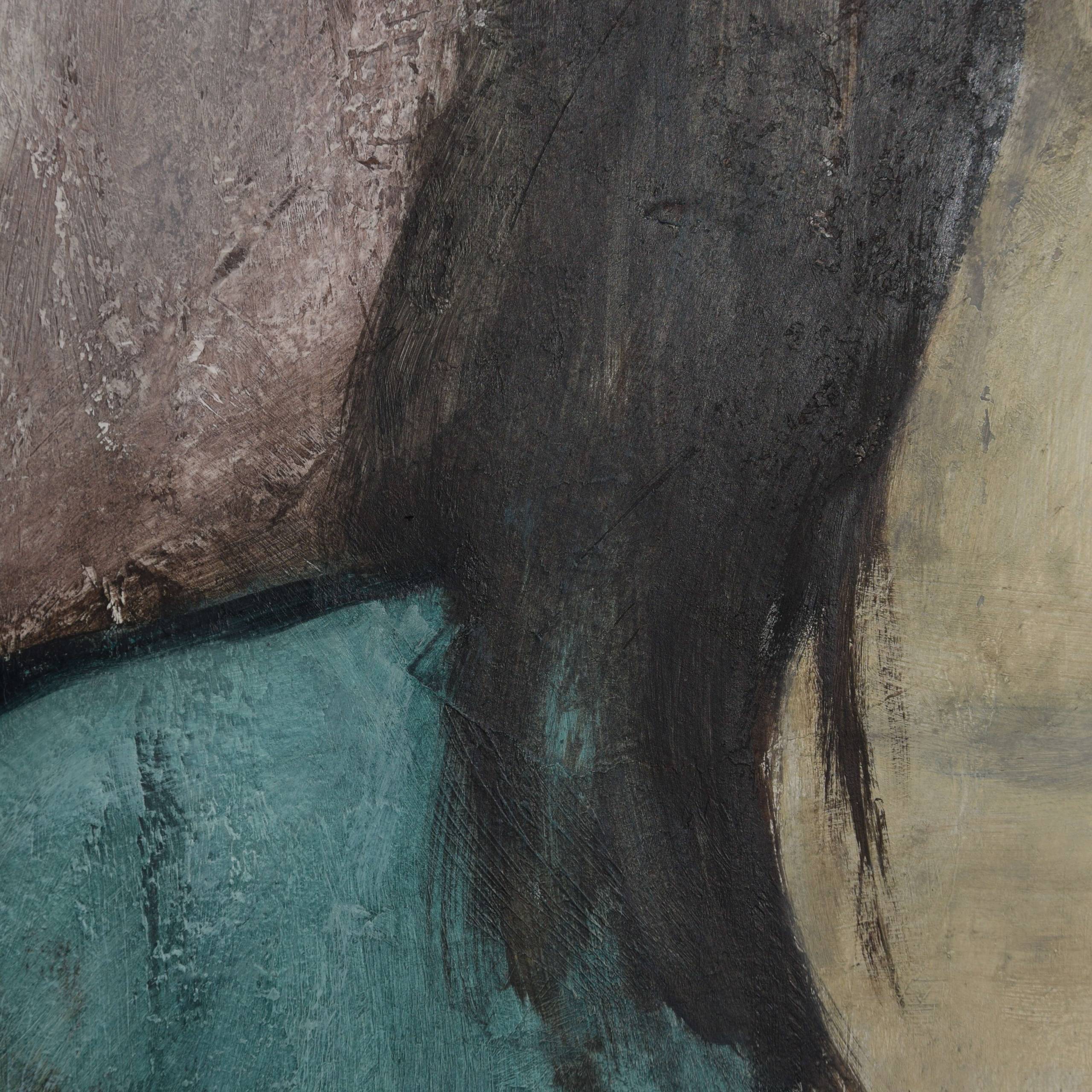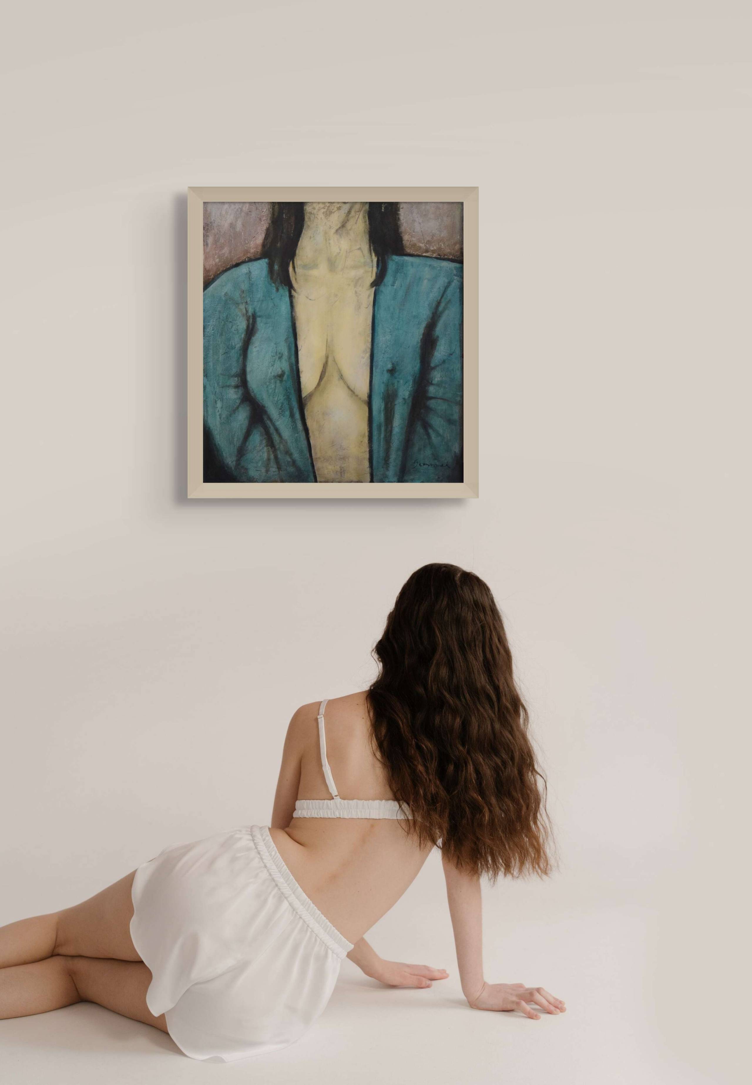 Na obrazie widzimy fragment sylwetki, której złocisto-beżowa skóra kontrastuje z głębokim, turkusowym odcieniem szaty, która lekko opada na ramiona. Kompozycja skupia się na centralnej części ciała, tworząc intymny, ale nieco tajemniczy klimat. Kolory są stłumione, odcienie są miękkie, a całość emanuje spokojnym, lecz intensywnym nastrojem. Twarz pozostaje poza kadrem, a to dodaje obrazu pewnej enigmatyczności. Styl artystyczny jest zbliżony do ekspresjonizmu z delikatnym użyciem kontrastów i tekstur. W użyciu pędzla dostrzec można pewną nerwowość, jakby artysta próbował uchwycić ulotność chwili. Moje serce bije szybciej, bo czuje się jakbym patrzył na tajemnicę. Interpretując to dzieło, można poczuć nostalgię, a może i tęsknotę za czymś nienamacalnym. Obraz wywołuje wrażenie skrywanej opowieści, która nigdy nie zostanie do końca odkryta. Dzieciak mógłby powiedzieć: "To wygląda jak schowany skarb". English word? Well, there's a certain 'mystery' that envelopes the whole scene. Ciekawość prowadzi nas do snucia własnych historii, a każde spojrzenie przynosi nowe emocje.