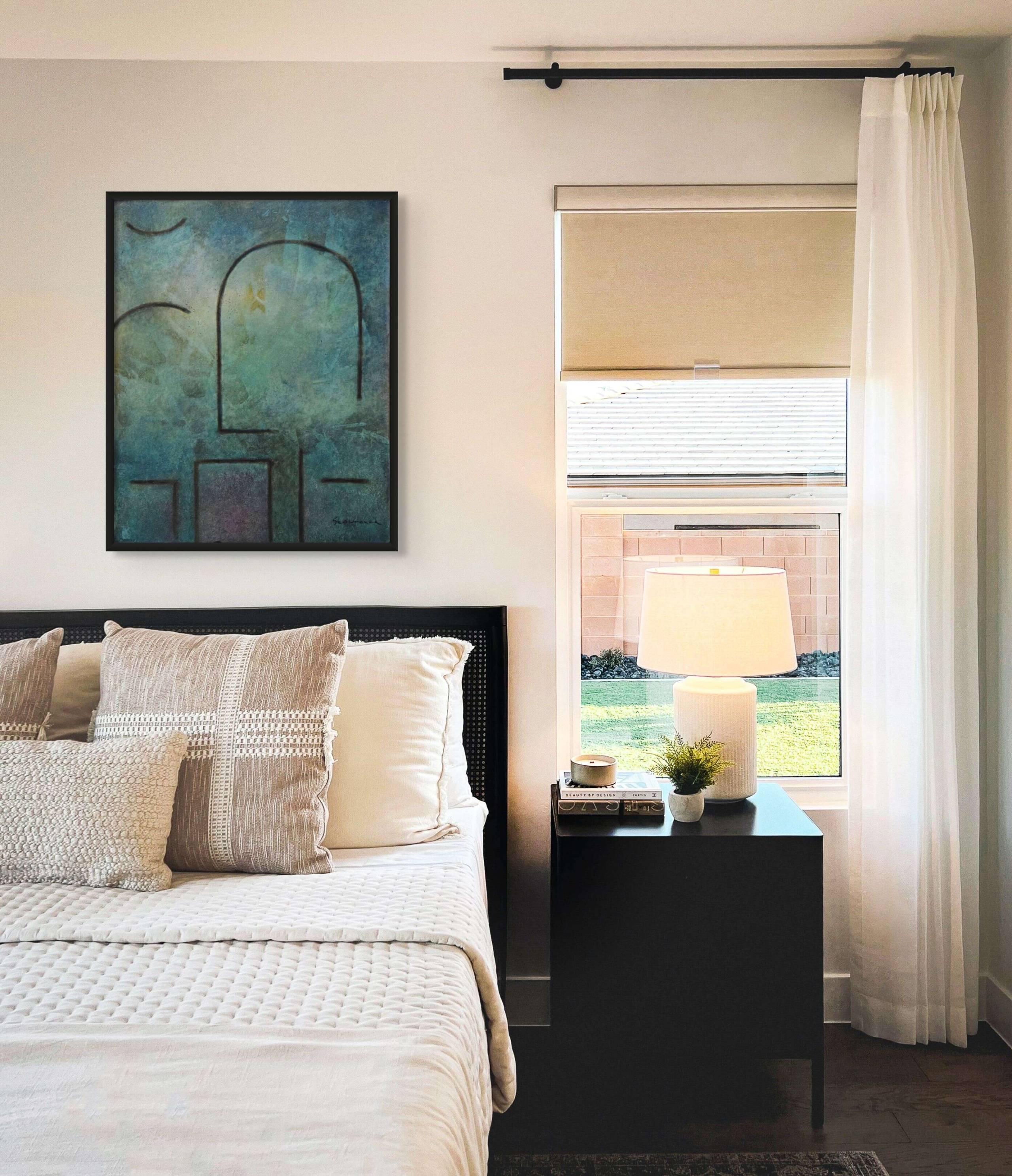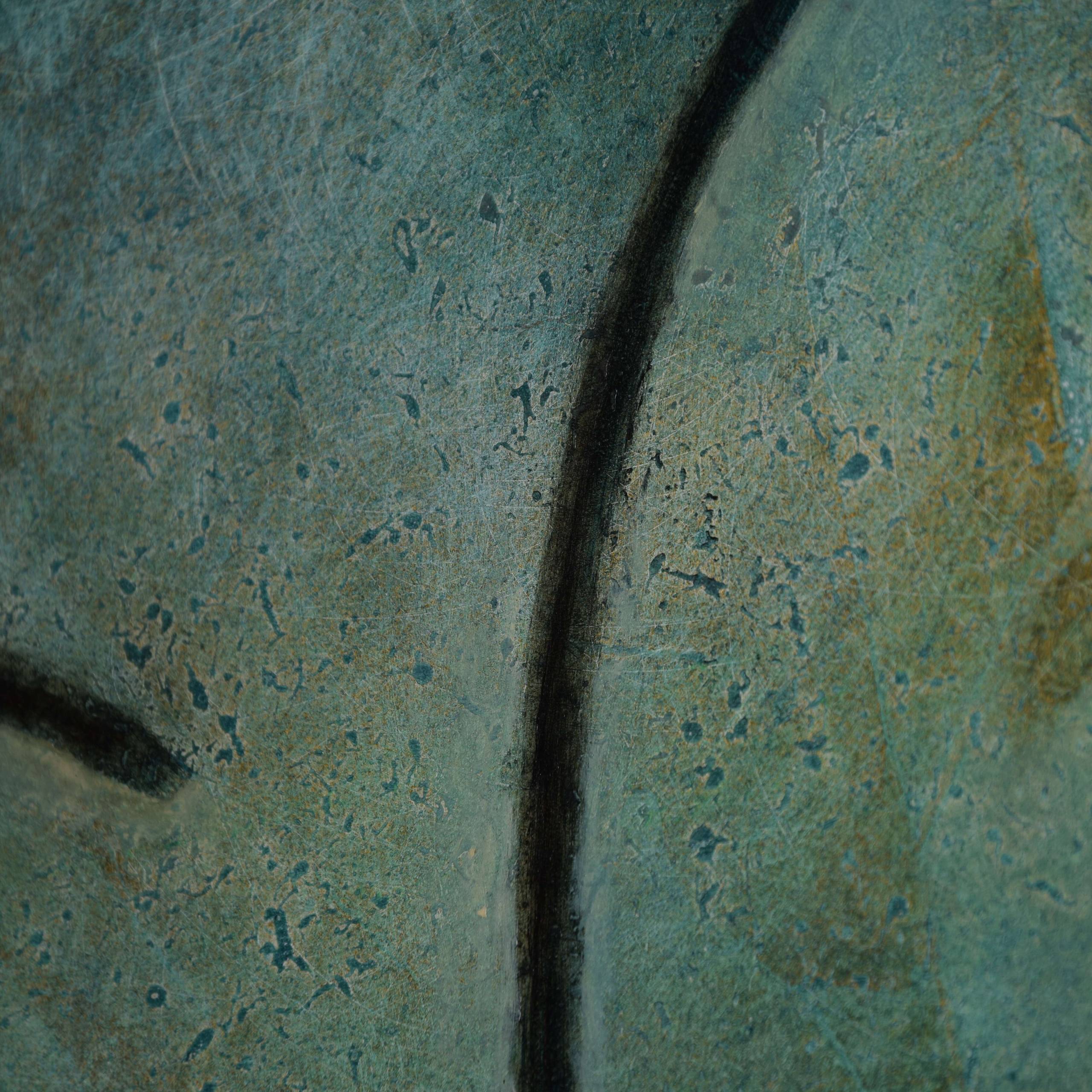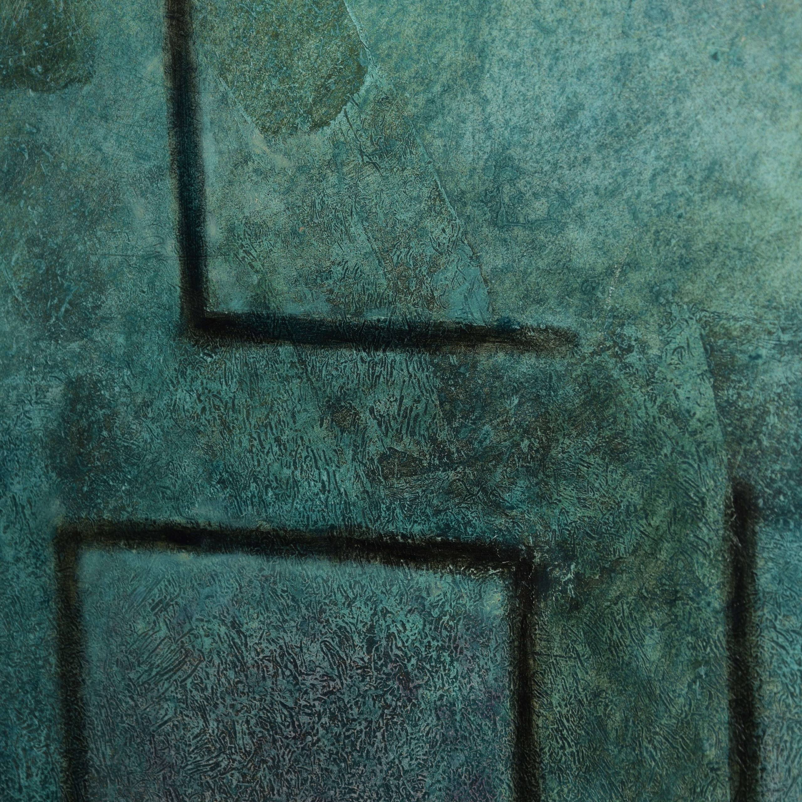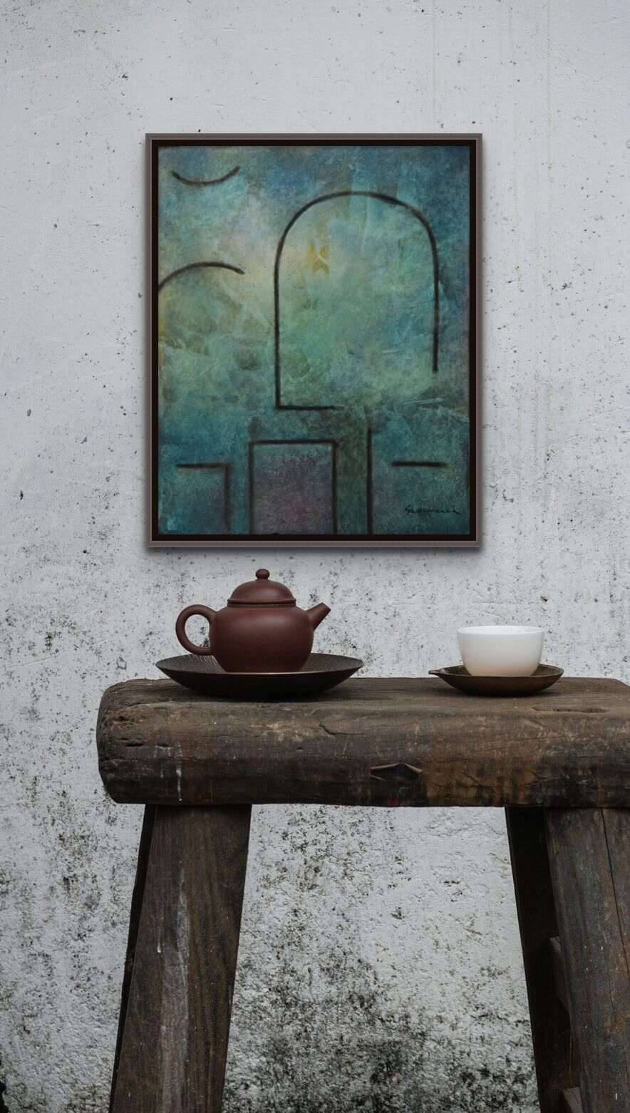Obraz emanuje nieuchwytnym pięknem. Dominują w nim subtelne odcienie zieleni i błękitu, które tworzą spokojną, niemal medytacyjną atmosferę. Wzory przypominają geometryczne formy, łuki i linie, które zdają się próbować opowiedzieć historię skrytą w tajemnicy. Wygląda to jak labirynt myśli, w którym można zatonąć. Kiedy patrzę na to dzieło, czuję spokój i lekkie oderwanie od rzeczywistości. Przyjemne zamieszanie, które się rodzi, sprawia, że fantazja zaczyna wędrować w nieznane. Artysta zastosował technikę delikatnego nakładania warstw farby, co nadaje teksturze i głębi całemu obrazowi. Efekt ten dodatkowo potęguje wrażenie trójwymiarowości. Jest coś magicznego w tej prostocie. Może to być sztuka abstrakcyjna, która bawi się naszym postrzeganiem rzeczywistości. Jeden zarys przypomina, jakby ktoś zostawił szeroko otwarte drzwi. Ten obraz jest zdecydowanie enigma. Wywołuje różnorodne emocje - od ulgi i spokoju po zagadkowy smutek. It catches your eye in a mysterious way. To prawdziwa perełka, która sprawia, że chcemy odkryć coś więcej. Chic po prostu piękny na swój unikalny sposób.