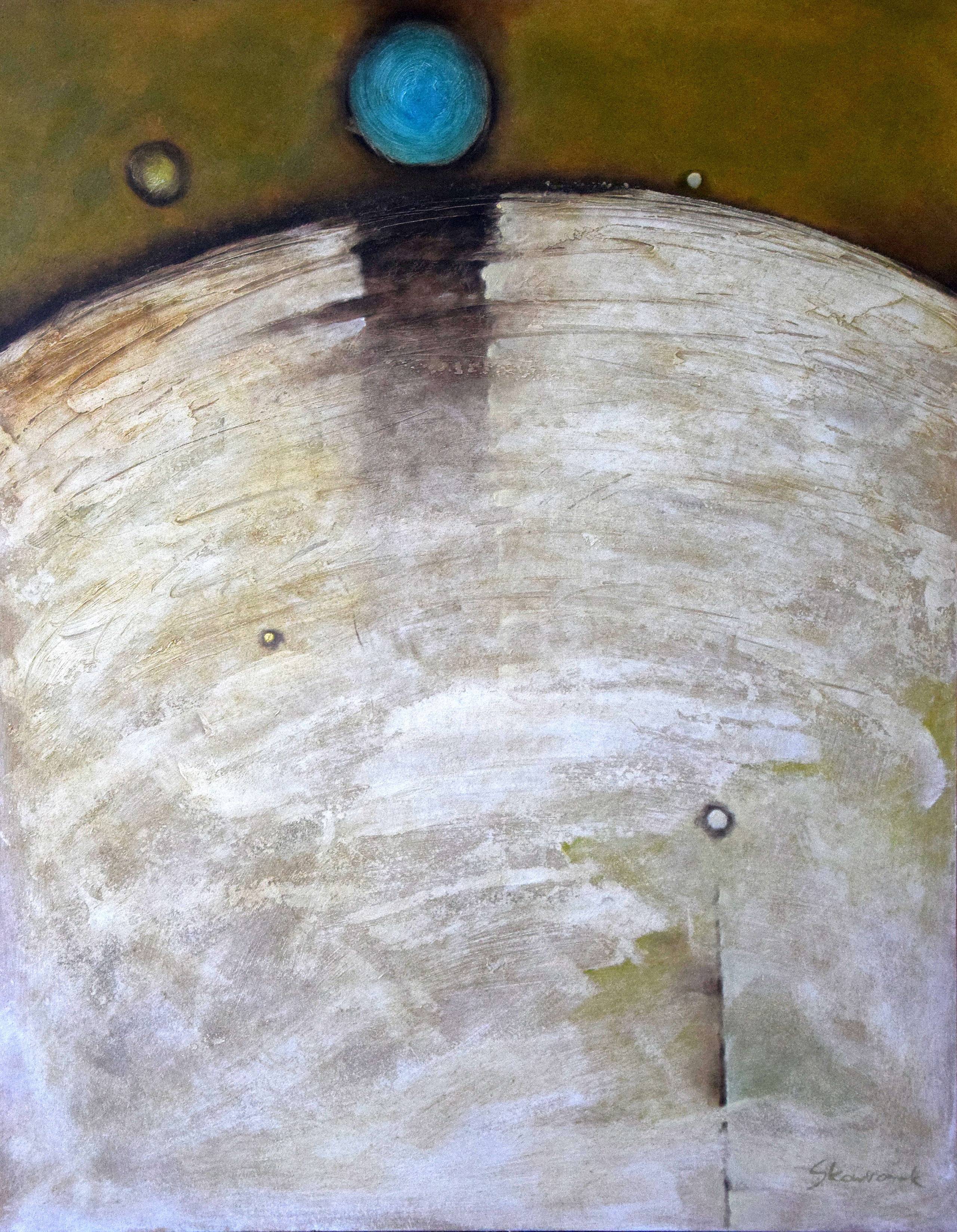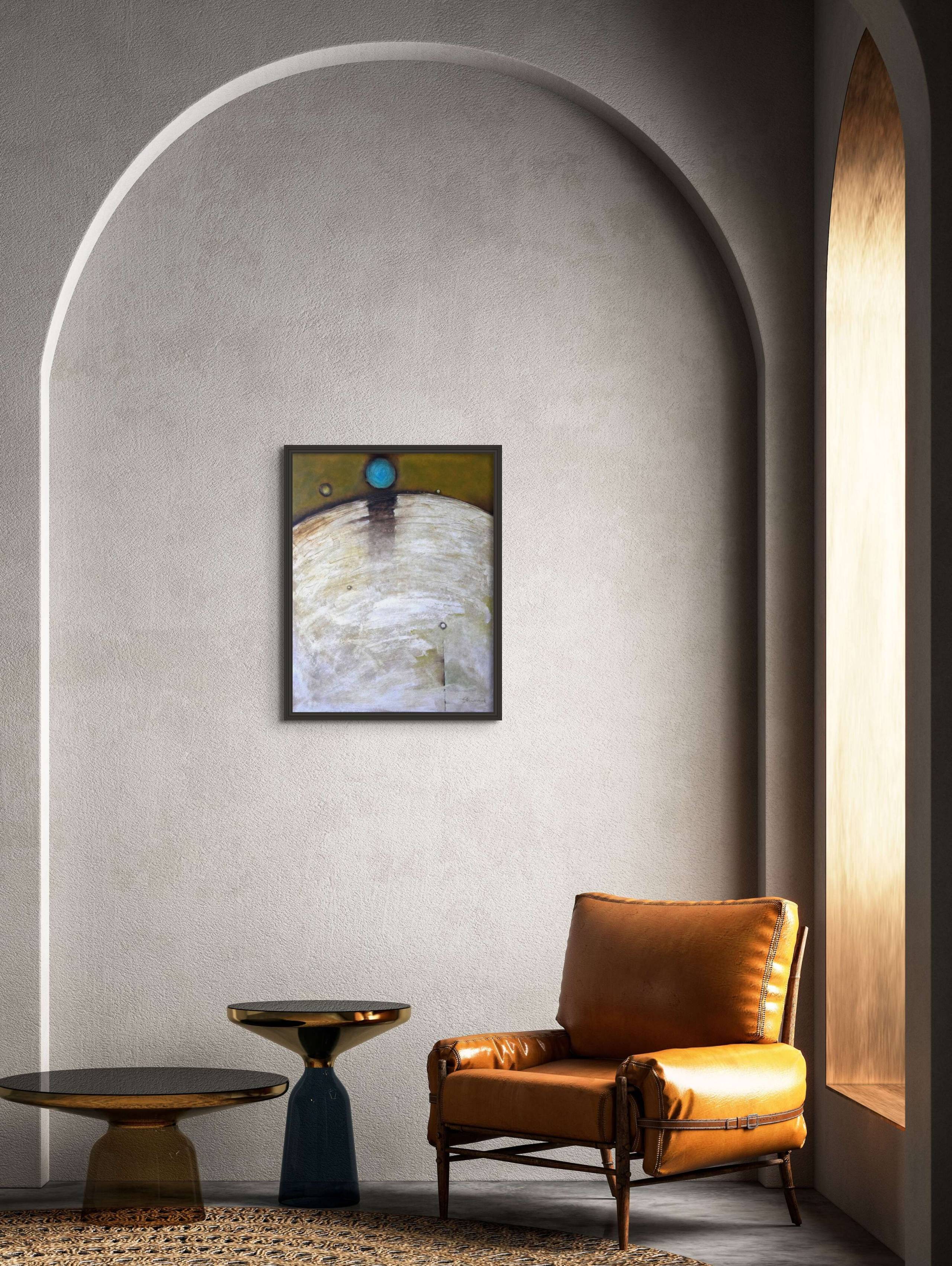 Obraz emanuje spokojem i tajemniczością. Kolory ziemi – brązy, beże i oliwkowe zielenie – przeplatane są niebieskimi akcentami, które przyciągają wzrok. Niesymetryczna kompozycja, z centralnym kołem w turkusowym odcieniu, nadaje dziełu oryginalności. Wywołuje wrażenie patrzenia na odległe światy lub planety, być może nawet na nieznany kosmos. Styl jest zdecydowanie abstrakcyjny, z miękkimi, płynącymi pociągnięciami pędzla, które dodają głębi. Artysta zastosował tu subtelną grę światłocienia, sprawiając, że powierzchnie wydają się być w ruchu. Trochę jakby ktoś rozlał kawę po stole, nie sądzisz? Atmosfera obrazu jest refleksyjna i medytacyjna, zachęca do zatrzymania się na chwilę i “zagubienia” w jego przestrzeni. Można poczuć się, jakby świat wokół nas zwolnił. Nieco dreamy, czyż nie? Młodsze dziecko mogłoby powiedzieć: "To jak kosmos na moim rysunku!". Odbiorca może dostrzec w tym obrazie własne emocje i historie. Każda osoba może zobaczyć coś innego – to właśnie magia sztuki. To idealne dzieło dla tych, którzy lubią oddać się marzeniom i uciec od codzienności. Patrząc na to wszystko, przychodzą do głowy tylko pozytywne myśli.