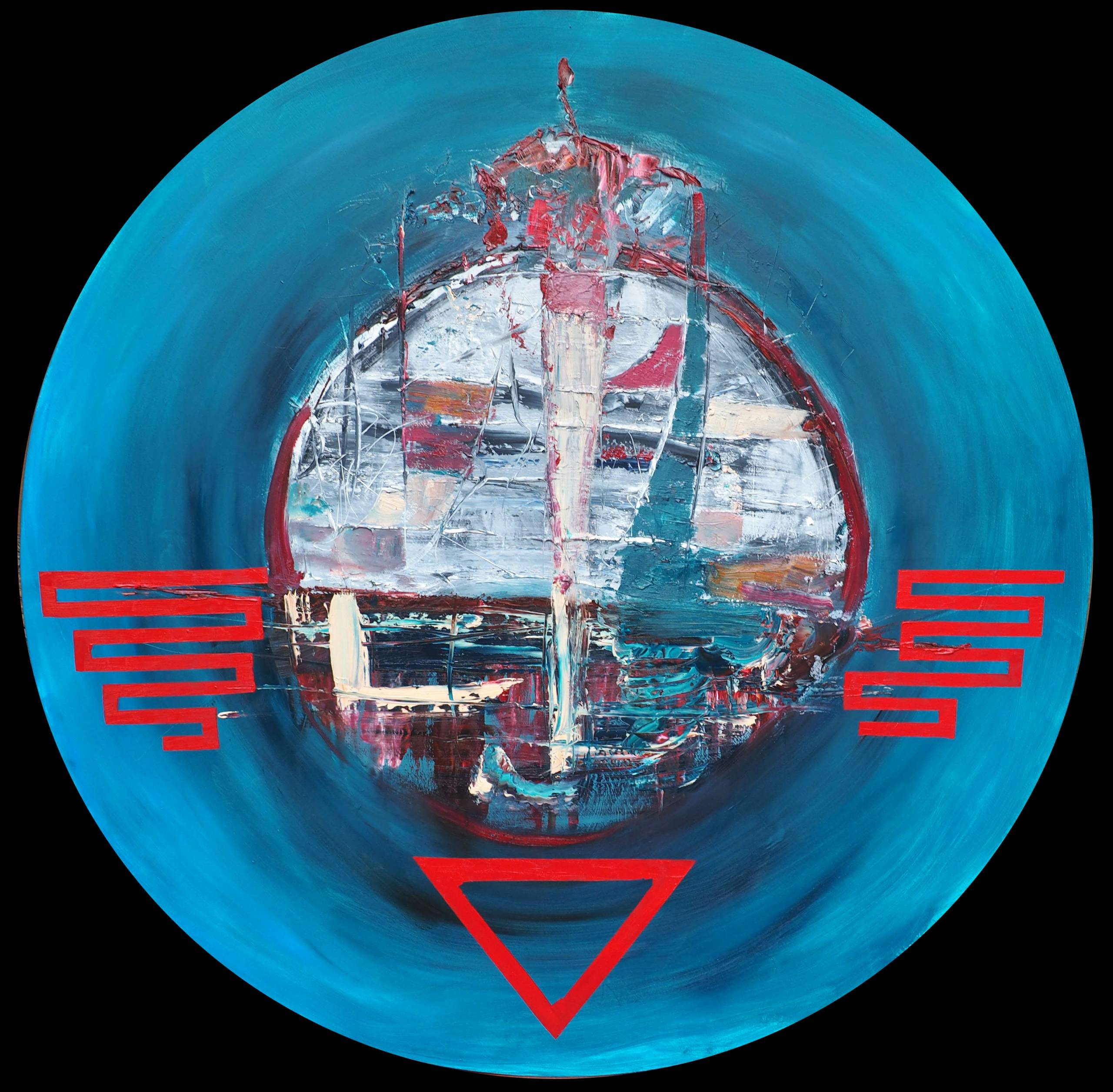Na obrazie widzimy dynamiczną kompozycję zdominowaną przez intensywny niebieski kolor, który otacza centralny okręg. W centrum dzieła jest abstrakcyjna struktura pełna kontrastujących barw, takich jak biel, czerwień i odcienie złamanej szarości. Wyraźne czerwone linie, przypominające geometryczne symbole, dodają obrazu energii, przyciągają wzrok i wzmacniają wrażenie harmonii i chaosu jednocześnie. Technika, jaką posłużył się artysta, to grube, teksturą pociągnięcia pędzla, co nadaje obrazowi głębi i ruchu. Atmosfera pracy jest pełna napięcia i tajemnicy, jakby zapraszała do odkrywania ukrytych znaczeń. Czuje się, jakby dzieło emanowało niepokojem i ciekawością. Styl tego malowidła przywodzi na myśl dynamiczny expressionism, z odrobiną modernistycznego twistu. Artysta z powodzeniem łączy chaos z kontrolą, balansując na granicy między porządkiem a napięciem. Dla mnie to przypomina podróż na dno oceanu, gdzie ciemność miesza się z niespodziewanym blaskiem. Może wywoływać uczucie zagubienia, a może fascynacji, to zależy od patrzącego. Jeden odbiorca powie „Wow!”, inny się zamyśli. Dla dziecka to będzie pewnie wielki kolorowy statek kosmiczny albo magiczna kula. Taka artystyczna podróż potrafi skłonić do refleksji, do zastanowienia się nad własnym miejscem w świecie. A ty? Co widzisz w tej intrygującej plątaninie barw i form?