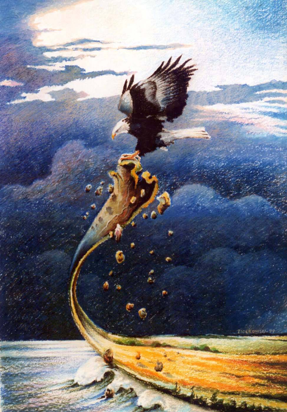 pastel na kartonie, rok 1999 Drapieżny ptak uniósł w powietrze kawał lądu robiąc miejsce morskim wzburzonym falom. Nastrój niepokoju potęgują ciemne burzowe chmury.