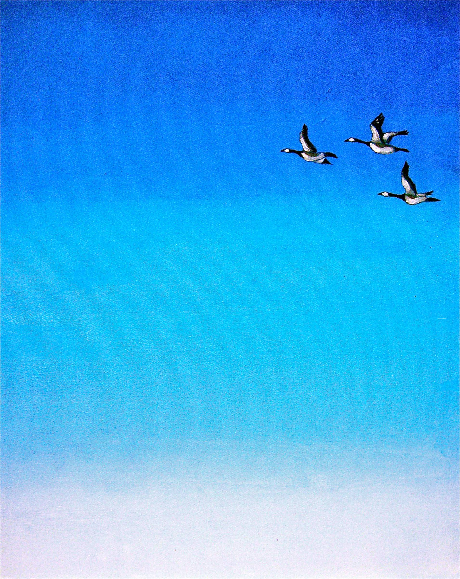 Das Bild zeigt drei Wildgänse im freien Flug am blauen Himmel,