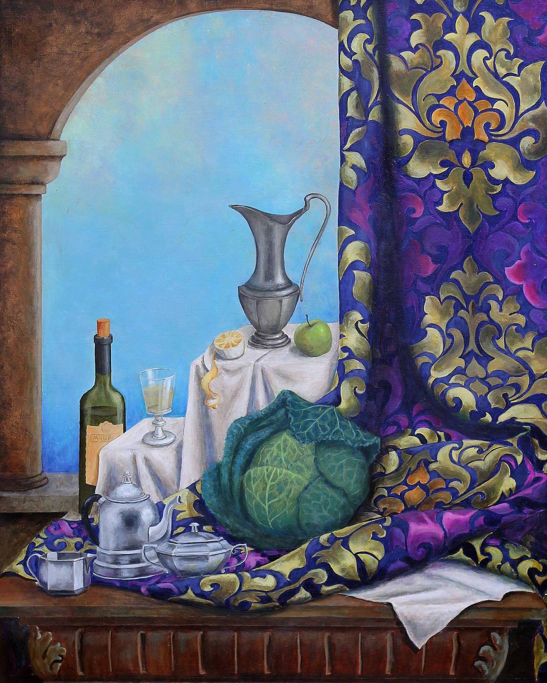 Obraz przedstawia martwą naturę z kompozycją pełną kontrastów i harmonii. Z lewej strony widzimy srebrny dzbanek pełen elegancji, obok którego spoczywa plaster cytryny na białym obrusie. Tło wypełnia delikatny niebieski gradient, który wspaniale komponuje się z bogatymi, ciepłymi tonami fioletowej tkaniny po prawej stronie. Na pierwszym planie widnieje zielona kapusta, która swoją fakturą i kolorem przyciąga wzrok. Atmosfera tego obrazu jest klasyczna, niemalże medytacyjna, jakbyśmy byli świadkami chwili uchwycenia codziennej elegancji. Artysta zastosował technikę realistycznego malarstwa olejnego, co umożliwia widzowi dostrzeżenie subtelnych niuansów barw i faktur. To dzieło może wywoływać poczucie spokoju, ale także pewien rodzaj tęsknoty za prostotą. Patrząc na całość, można pomyśleć: "Wow, to trochę jak magiczna sekunda zatrzymana w czasie." Jest coś pociągającego w tej prostocie i przy tym bogactwie kolorów. Dla siedmiolatka, obraz mógłby być jak scena z bajki, gdzie produkty ożywają i mają sekretne życie. To kind of reminds you, że piękno tkwi w szczegółach i codziennych przedmiotach, którym zwykle nie poświęcamy wystarczająco uwagi.