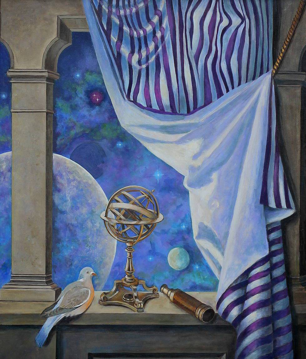 Na obrazie widzimy spokojnie scenę, która łączy w sobie kosmos i ziemską rzeczywistość. Dominuje ciemnoniebieskie tło, przypominające nocne niebo pełne gwiazd, oraz różne odcienie fioletu i bieli, które nadają całości tajemniczy nastrój. W centrum znajduje się okno z elegancką zasłoną o paskowanym wzorze, rozwiewaną delikatnie jakby przez niewidoczny wiatr. Przy parapecie spoczywa duża sfera armilarna z brązu, tuż obok leży teleskop, a na brzegu przysiada ptak. Wow! Kosmiczna atmosfera obrazu jest niemal magiczna. Artysta używa realistycznego stylu, ale z nutą surrealizmu, łącząc elementy nauki i natury. Rzemieślnicza precyzja w rysunku i malowaniu detali, takich jak refleksy na metalu czy subtelne cienie, daje wrażenie głębi i autentyczności. Ten obraz może budzić w odbiorcy uczucie zadumy nad nieskończonością wszechświata i naszym miejscem w nim. Może nawet popychać do refleksji, że życie, podobnie jak sztuka, jest pełne unexplained mysteries. Opisałbym ten obraz jako harmonijne połączenie nauki ze sztuką, które zaprasza do odkrywania. Ciekawi mnie, co myślał artysta, tworząc tę wizję. Patrząc na niego, czuję się częścią większej całości, gdzie kosmos i ziemia splatają się w jednym momencie.