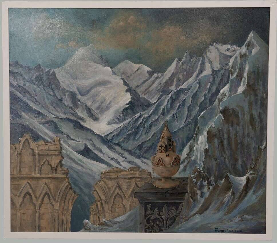 Obraz przedstawia majestatyczne góry ośnieżone śniegiem. Dominuje tu chłodna paleta kolorów – niebieskich, białych i szarych. Na pierwszym planie widoczne są fragmenty ruin – być może to pozostałości jakiegoś pradawnego zamku. Ich piaskowcowy kolor kontrastuje z zimnym pejzażem. Centralnie, na kamiennej podstawie, stoi tajemnicza ozdoba przypominająca kadzielnicę, której detale wzbudzają ciekawość. Nastrojowy jest ten obraz, niemal magiczny, sprawiający wrażenie, że coś niezwykłego może się tam wydarzyć. Styl obrazu jest realistyczny z nutą romantyzmu. Artysta użył subtelnych pociągnięć pędzla, co widać w delikatnych przejściach kolorów na niebie i górach. Atmosfera tej pracy może przywodzić na myśl spokój, ale i pewną tajemniczość. Z jednej strony, obraz może wywoływać nostalgia za nieznanym światem fantasy. Z drugiej, przypomina o potędze natury – pięknie i niebezpieczeństwie jednocześnie. Patrząc na to dzieło, moje myśli wędrują w stronę epickich opowieści. "Wow, tak wysoko!", powiedziałoby dziecko, zachwycone widokiem. Ten landscape zdaje się żyć własnym życiem, almost like it's breathing. Obejmuje ciszą i skłania do refleksji, co jeszcze może kryć się za tymi szczytami.