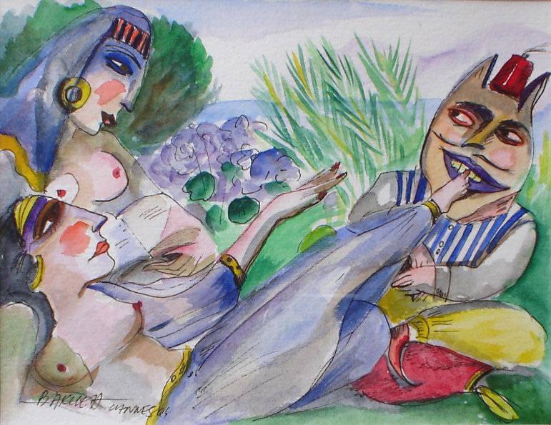 Obraz jest pełen życia i kolorytu. Dominują na nim intensywne barwy: zielenie bujnej roślinności, fiolety i czerwienie, które wabią oko jak magnes. Kompozycja wydaje się być chaotyczna, ale przyciąga uwagę. Postaci na pierwszym planie przybierają dziwaczne pozy, ich ciała wiją się i skręcają niczym sprężyny. W tle zarysowują się zielenie roślin, które tworzą piękną, ale nieco senną scenerię. Obraz emanuje atmosferą tajemnicy i nieco surrealistycznym nastrojem, co sprawia, że trudno oderwać wzrok, zastanawiając się, co autor miał na myśli. Artystyczny styl przypomina nieco ekspresjonizm, z dynamicznymi pociągnięciami pędzla i odważnym użyciem kolorów. Technika malarska sugeruje spontaniczność i wolność wyrażenia, na pewno przykuwa wzrok i skłania do refleksji. Dzieło może budzić w odbiorcy mieszane uczucia. Trochę śmiechu, trochę konsternacji. Wywołuje pytanie, o co w tym wszystkim chodzi. Te postaci z wielkimi oczami i uśmiechami jak z kreskówki. Jakby się bawiły w teatrzyk. A może to jakieś party u znajomych? To takie „funny”, że aż zastanawiam się, czy to nie alegoria życia. Prawie czuć, jakby każdy element obrazu chciał opowiedzieć swoją własną historię. Fascynujące.
