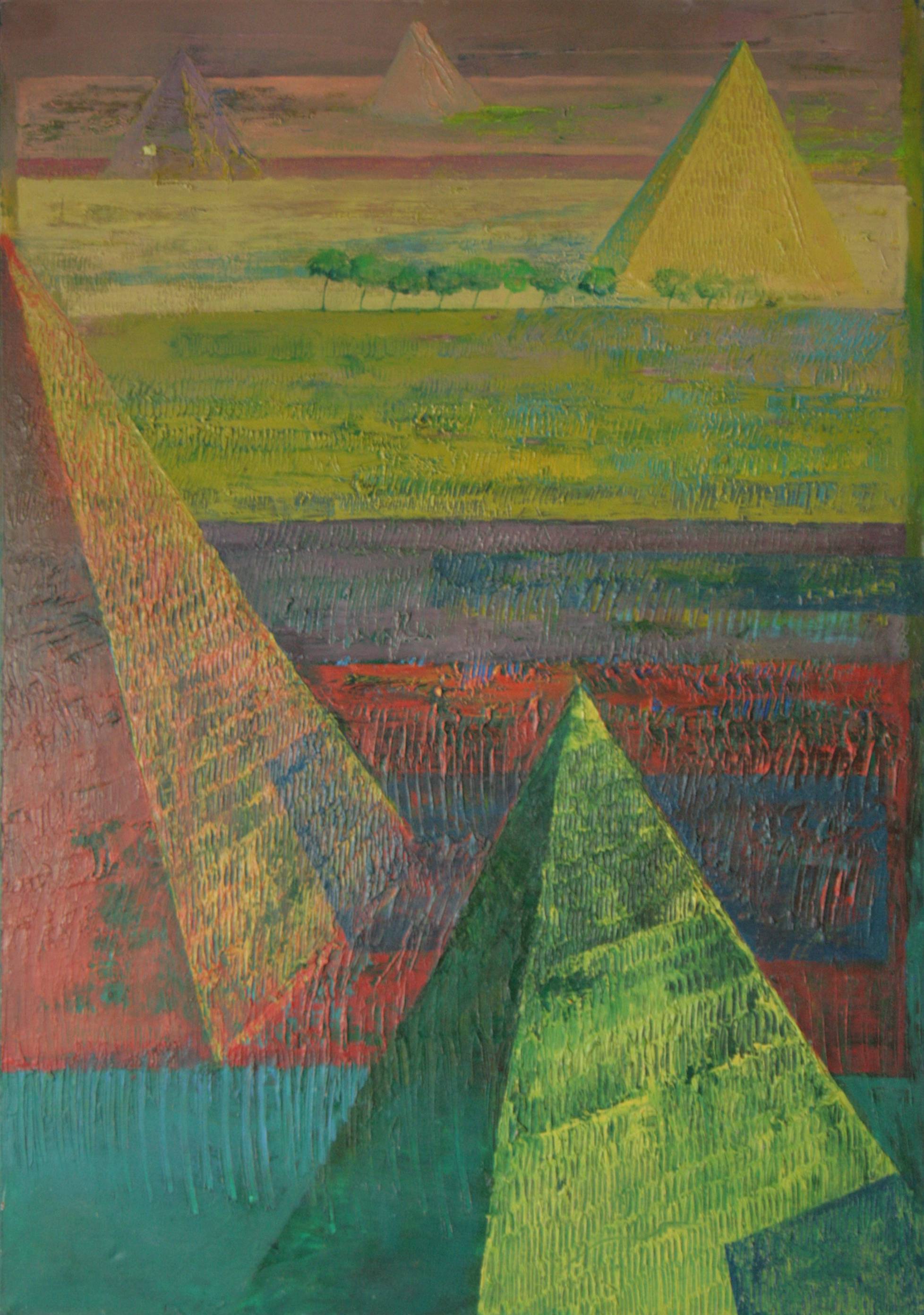 Na obrazie widać rozległy krajobraz z piramidami, które dominują w kompozycji. Kolory są ciepłe i żywe: zielone, żółte, czerwone, co tworzy dynamiczny kontrast. Piramidy wyrastają dumnie, sięgając niemalże nieba. Ich trójkątne kształty nadają scenie geometryczną precyzję. Otoczenie jest pełne tekstur, przypominających pociągnięcia pędzla, które wydobywają z ziemi trawiaste pola i drzewa jak z bajki. Atmosfera obrazu jest tajemnicza, jakby wyciągnięta z innych czasów. Artysta użył techniki impasto, co dodaje głębi i sprawia, że obraz "żyje". Nasycenie barw i faktura przyciągają wzrok, niemal zapraszając do zanurzenia się w tej pradawnej krainie. Ten widowiskowy spektakl może budzić nostalgię albo ekscytację. Może ktoś przypomni sobie wakacje marzeń. Ja bym chciał tam być! Dziecko powiedziałoby – te piramidki są jak zamek dla mrówek! Obraz emanuje spokojem, ale także wywołuje delikatne napięcie, jak oczekiwanie na burzę. To trudne do opisania "vibe", który pozostaje długo po zetknięciu.