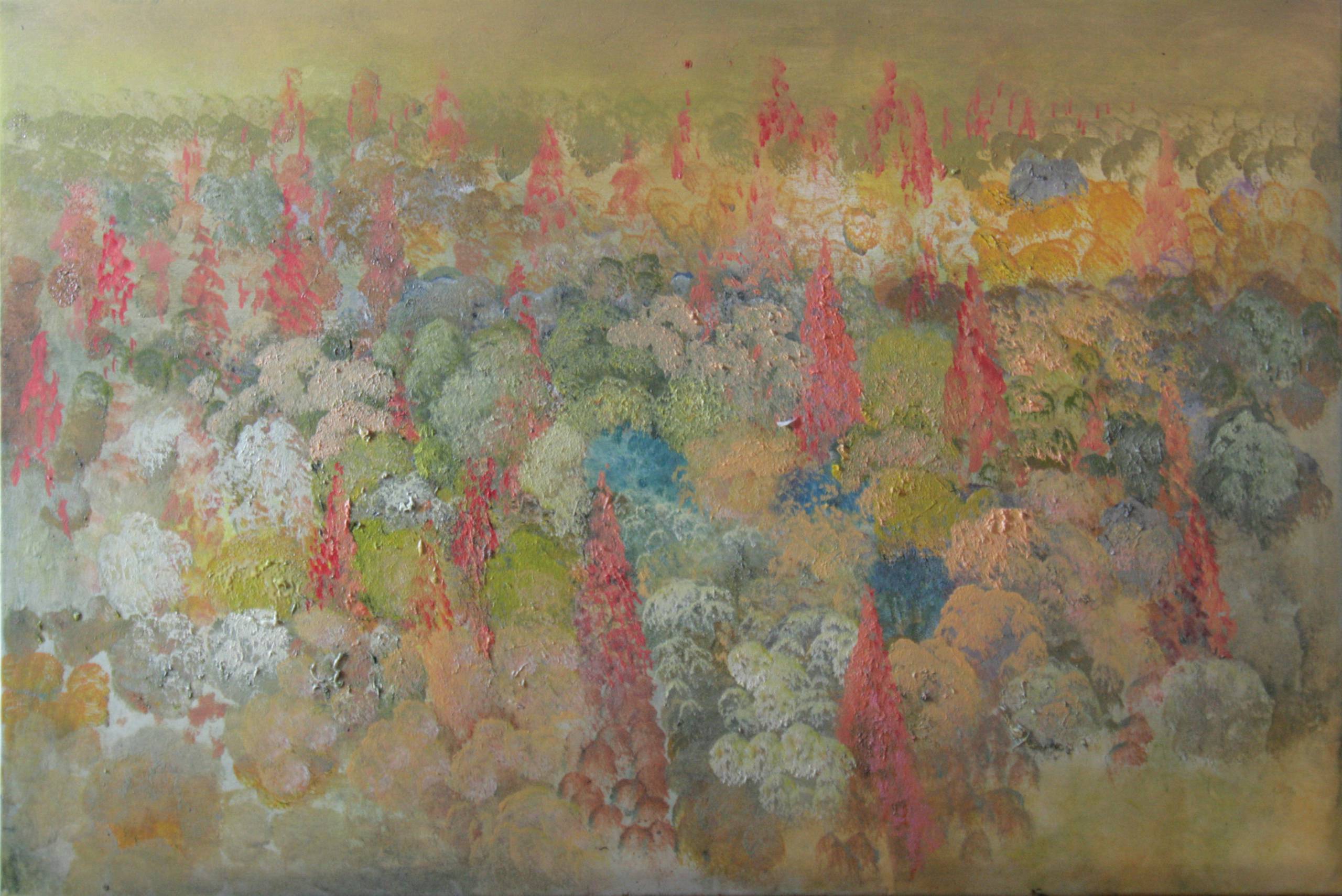 Na obrazie widzimy z pozoru chaotyczną plątaninę kolorów, która z bliska ukazuje bajkowy las fantazji. Miks zieleni, ciepłych brązów i czerwieni dominuje w kompozycji. Drzewa malowane techniką impasto, wydają się niemal trójwymiarowe, a ich kształt przypomina migoczące płomyki. Atmosfera dzieła przenosi nas do magicznego świata, gdzie wszystko zdaje się pełne życia i energii, a przyroda żyje w harmonii z kolorami. Artysta posłużył się zamaszystymi pociągnięciami pędzla, by nadać swojemu dziełu dynamizmu i ekspresji. Styl przypomina trochę impresjonizm, ale z domieszką abstrakcji. Odbiorca może poczuć nostalgie za utraconym światem dzieciństwa, gdzie każda polana skrywała tajemnice. Patrzę na ten obraz i czuję, jakby czas spowalniał, a serce biło w rytmie natury. To a dreamy forest, w którym można by się zgubić na zawsze. A te czerwone drzewa są jak płonące ognie, które rozgrzewają duszę. Niekiedy przypomina mi się beztroska dzieciństwa, gdy wyobraźnia była kluczem do każdego królestwa. Może być też tak, że dla innych to zwykły krajobraz, ale ja widzę melodię kolorów, które tańczą do rytmu serca.