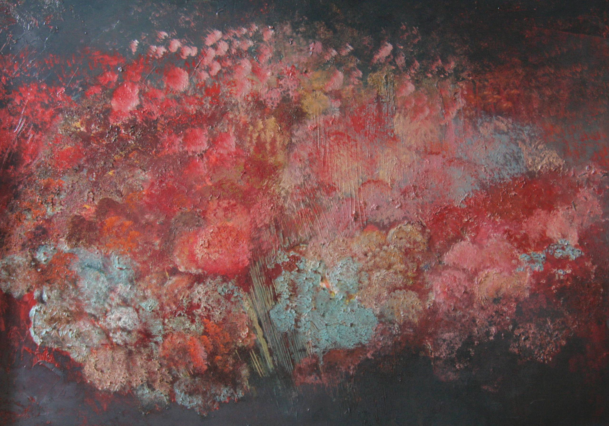 Na obrazie dominują intensywne odcienie czerwieni, różu i brązu, które tworzą dynamiczną kompozycję pełną energii i życia. Plamy barw, przypominające eksplozję kolorów, przenikają się nawzajem, tworząc głębię i teksturę, jakby artysta celowo chciał uchwycić chaotyczny taniec kolorów. W tle widać ciemniejsze, niemal czarne przestrzenie, które kontrastują z jasnymi partiami, dodając dramatyzmu i tajemniczości. Sprawia to, że obraz może wydawać się zarówno ciepły, jak i nieco mroczny. Technika jest tu wyraźnie ekspresyjna. Artysta używa impastu, co sprawia, że powierzchnia obrazu jest niejednolita i niemal trójwymiarowa. Różnorodność faktur, od gładkich po szorstkie, dodaje dziełu dynamiki i intrygującego charakteru. Wydaje mi się, że ten obraz mówi coś o chaosie i pięknie przyrody. Dla mnie to trochę wygląda jak ogień, który tańczy na płótnie. Atmosfera emanowana przez dzieło jest pełna niepokoju, ale też ekscytacji, jakby moment przed wielkim wydarzeniem. Wow, jakie to intense! Dzieciak mógłby powiedzieć, że to wygląda jak wielka farbowa plama. Obraz skłania do refleksji nad dzikością i nieprzewidywalnością świata.