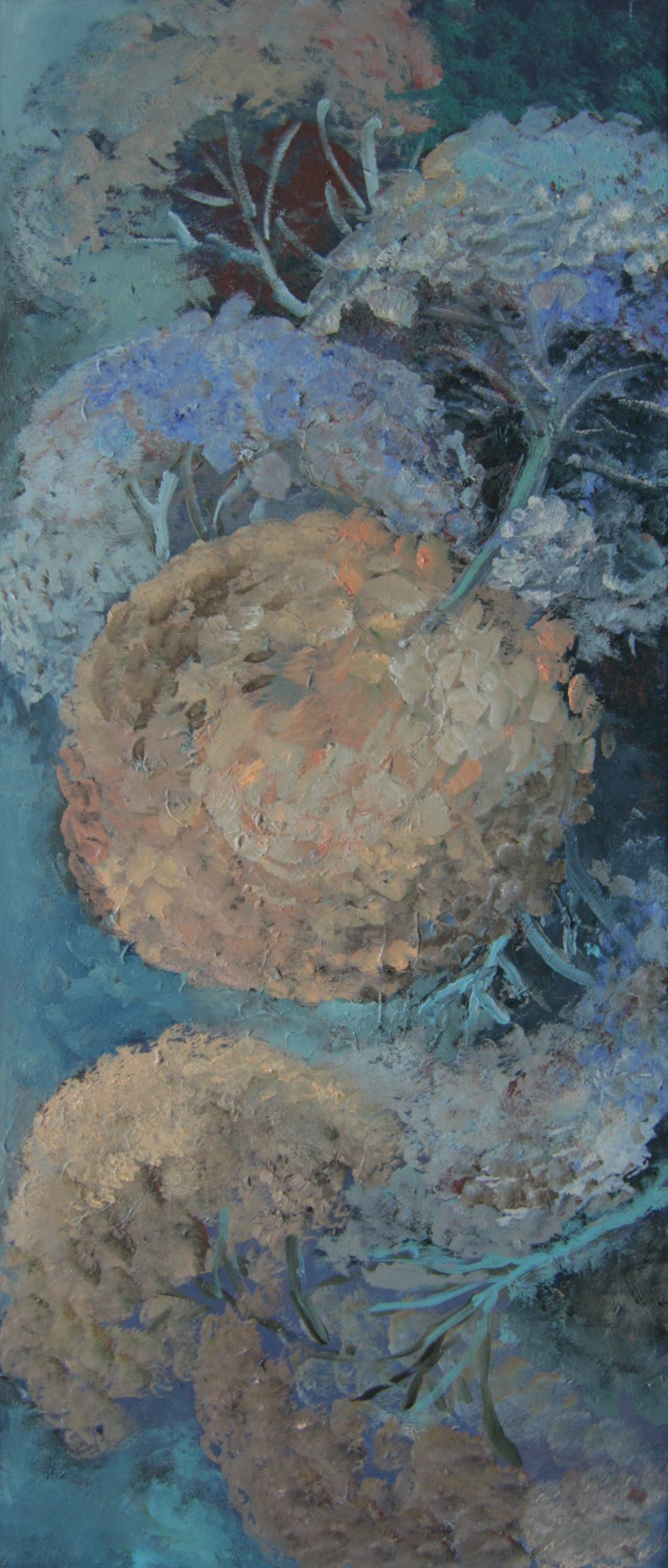 Obraz przedstawia kompozycję przypominającą delikatne baldachimy kwiatów. Paleta kolorów jest przytłumiona i spokojna, dominują tu odcienie błękitu, turkusu oraz ziemiste beże. Tekstura farby olejnej nadaje dziełu organiczny, niemal trójwymiarowy charakter. Kształty są miękkie i zaokrąglone, co sprawia, że całość wydaje się niezwykle harmonijna. Atmosfera, którą emanuje ten obraz, jest nieco tajemnicza i nostalgiczna. Przypomina senne marzenia lub wspomnienia z dzieciństwa. Ten obraz to poetry in motion. Styl artystyczny można by określić jako impresjonistyczny. Artysta skupił się na uchwyceniu emocji i gry światła, a nie szczegółach. Swobodne pociągnięcia pędzla sprawiają, że odbiorca czuje jakby patrzył na naturę przez mgłę. Obraz wywołuje uczucie spokoju, ale też pewnej melancholii. Może rodzić refleksję nad przemijaniem i pięknem chwili. Dziecko powiedziałoby: „Te kwiatki są jak chmurki na obrazku”. Patrząc na ten obraz, można poczuć, jak codzienne troski odpływają, a serce wypełnia spokojem.