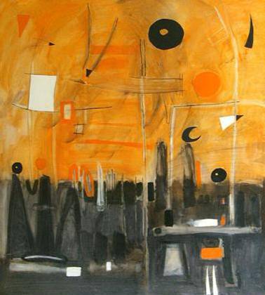 Obraz, który masz przed oczami, to prawdziwa eksplozja kolorów i kształtów. Dominują odcienie pomarańczu i czerni, które tworzą kontrastową, dynamiczną kompozycję. Złote tony przypominają zachód słońca, podczas gdy ciemniejsze plamy sugerują tajemnicę i głębię. Kształty są abstrakcyjne, nieco chaotyczne, jakby ktoś wyrzucił garść geometrycznych figur na płótno i pozwolił im tam zostać. Ta mieszanka ostrych i miękkich linii sprawia, że obraz emanuje pewnym niepokojem, ale też energią. Wydaje się, że artysta użył techniki impastu, nakładając farbę grubą warstwą, co dodaje tekstury i żywotności. Styl jest abstrakcyjny, może nawet z domieszką surrealizmu, co sprawia, że widz ma duże pole do interpretacji. Czuć tu nutkę nostalgii, jakby te wszystkie kształty opowiadały jakąś forgotten story. Dla jednych to obraz chaosu, a dla innych harmonia niespójnych elementów. Ma to coś w sobie, co przyciąga wzrok i każe się zatrzymać na dłużej. A małe dziecko pewnie by powiedziało: "Ale fajne kolory!". Osobiście, czuję się zaintrygowany, jakby obraz zapraszał mnie do odkrycia ukrytych tajemnic. To, co najbardziej captivating, to sposób, w jaki artysta bawi się widzialnym i niewidzialnym, jakby zapraszał widza do swojego świata.