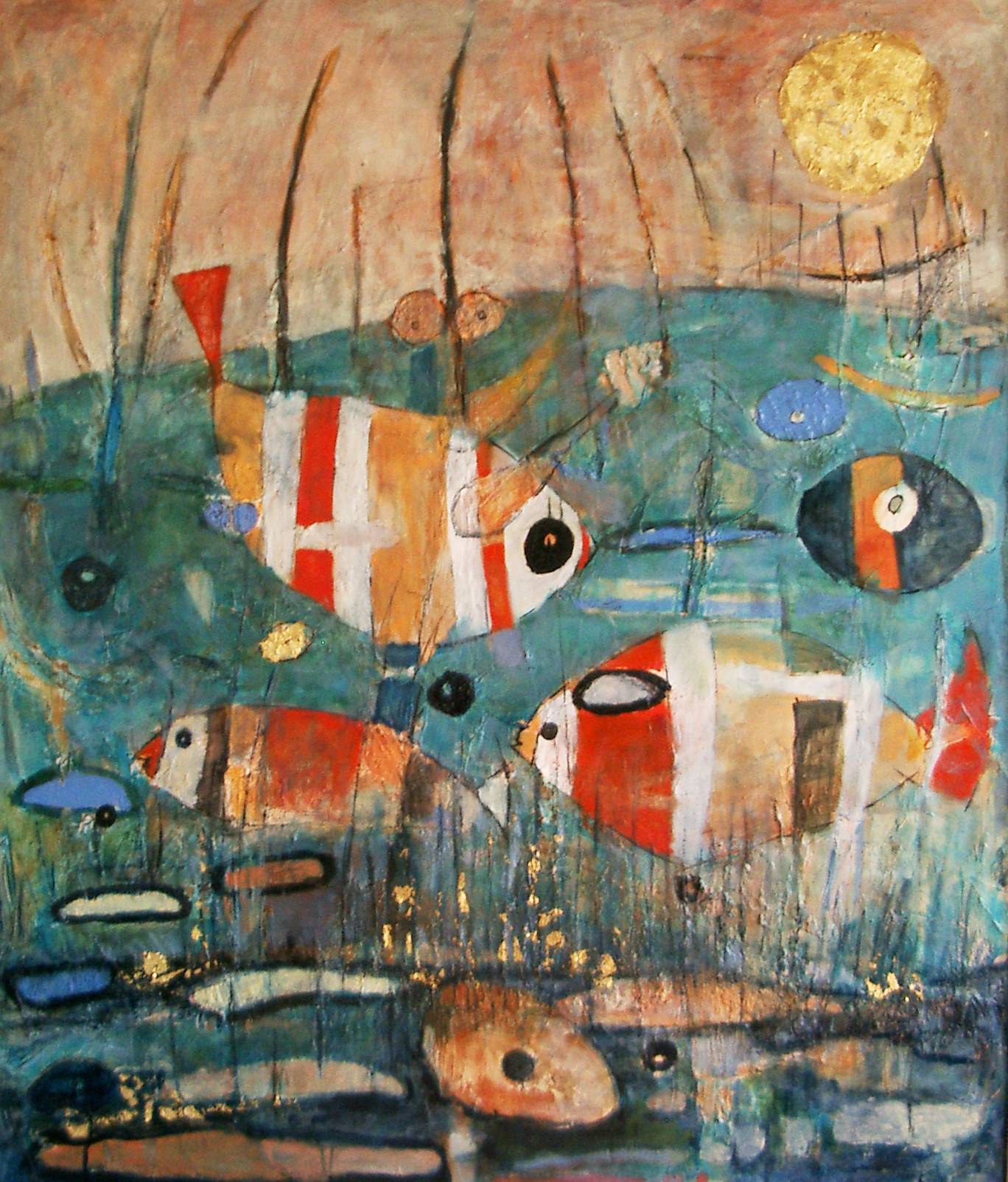 Na obrazie dominują żywe kolory z intensywnymi odcieniami niebieskiego, czerwieni i złota. Na pierwszy plan wysuwają się ryby, sportretowane w uproszczony, geometryczny sposób, dodają obrazowi pewnej abstrakcji. Słońce, niczym wielki, złoty krąg, spogląda z góry jakby mówiąc „tu jestem!”. Kompozycja jest dynamiczna, z rybkami unoszącymi się niby w tańcu wśród fal. Całość ma w sobie coś magicznego, to jakby kawałek baśniowego świata zamknięty w ramie. Artystyczny styl jest swobodny, z widocznymi wpływami abstrakcjonizmu – artysta użył mieszanki kolorowych plam i linii, by oddać ruch i życie podwodnego królestwa. Techniką malowania przypomina nieco dreamlike quality, wprowadzając odbiorcę w stan refleksji. Gdy patrzę na to dzieło, czuję spokój, ale też jakąś wewnętrzną radość. Dla mnie to jak kolorowy sen, do którego chętnie powracałbym w trudniejszych chwilach. A rybki wyglądają jak z bajki, której nie znam, ale chciałbym usłyszeć. Ten obraz na pewno zostanie z Tobą na dłużej.