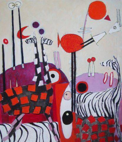 Obraz zaskakuje feerią barw i abstrakcyjną kompozycją. Rozedrgane, nieregularne kształty przeplatają się, tworząc niesamowity kalejdoskop kolorów – od intensywnych czerwieni i fioletów po stłumione czernie i biele. W centrum uwagę przykuwa dziwaczne stworzenie z długimi nogami. Wygląda jak mieszanka zebra i żyrafa, otulona wzorem przypominającym szachownicę. Kolory są bardzo vivid i przyciągają wzrok na dłużej. Całość obrazu emanuje optymizmem i humorystycznym podejściem. Styl artysty to eksplozja abstrakcji z figlarną nutą surrealizmu. Widać ślady dynamicznych pociągnięć pędzlem, które dodają kompozycji ruchu, jakby postacie na płótnie za chwilę miały ożyć. Obraz ten może wzbudzać zarówno zachwyt, jak i konsternację. Jakie emocje w Tobie budzi? Jest też coś czysto dziecięcego w tej mieszance form i kolorów. "Ooo, patrz, to wyglonda jak żyrafa z kosmosu!" – mogłoby powiedzieć dziecko. Patrząc na to dzieło, można poczuć migotanie w sercu, przypominające o nieograniczonej wyobraźni. Jedno słowo, które przychodzi na myśl, to whimsical – odzwierciedlające jego powierzchowną beztroskę i złożoną głębię. Ten obraz to prawdziwa uczta dla oczu i duszy, pełna niespodzianek i emocji.