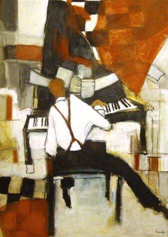 Na obrazie widzimy pianistę w białej koszuli z szelkami, który z pasją gra przy fortepianie. Kolory dominujące to ciepłe odcienie brązu, które przeplatają się z czernią i bielą, tworząc dynamiczną, ale jednocześnie harmonijną kompozycję. Całość sprawia wrażenie, jakby nuty same tańczyły w powietrzu. Artysta wykorzystał technikę swobodnego pociągnięcia pędzla, nadając obrazowi nieco abstrakcyjny charakter. Odbiorca może poczuć atmosferę nostalgii i skupienia; ten moment uchwycony na płótnie tętni życiem i emocjami. "Look!", powiedziałby zachwycony siedmiolatek, patrząc na to ekspresyjne dzieło. Styl obrazu przyciąga uwagę swoją prostotą i wyrafinowaniem jednocześnie. Nie sposób oderwać wzroku od tych geometrycznych kształtów i płynności linii. Czujesz, jak serce zaczyna bić w rytmie granej melodii. Wzrok podąża za ruchami pianisty, jakby chciał odczytać melodię prosto z płótna. To dzieło prowokuje do refleksji i zachwytu nad chwilą, która trwa wiecznie.