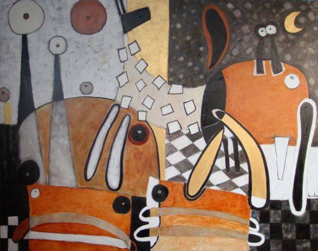 Obraz wyróżnia się kombinacją jaskrawych pomarańczy i stonowanych szarości, które tworzą dynamiczny kolaż kształtów i linii. Geometria rządzi tą kompozycją, kształty przypominają nieco figury zabawek, z kulistymi głowami i długimi, zakrzywionymi liniami, które układają się w abstrakcyjne formy. W tle, szachownica nadaje całości rytm, kontrastując z bardziej organicznymi elementami. Atmosfera tego dzieła jest pełna energii, niemalże tętniąca życiem. Stylistycznie można tu dostrzec wpływy kubizmu, gdzie artysta śmiało operuje formą i kolorem. Jest tu coś nieco nieokiełznanego, co wywołuje w widzu uczucie ciekawości, może nawet niepokoju. "Wow, ale duże te kwadraty!" to mogłoby powiedzieć dziecko, patrząc na tę pracę. Technika zastosowana przez artystę zdaje się być mieszanką malarstwa olejnego z kolażem. Praca w sposób playful łączy elementy rzeczywistości z fantazją, otwierając pole dla różnych interpretacji. Patrząc na to, myślę o dzieciństwie i zabawkach, które ożywają w niespodziewany sposób.