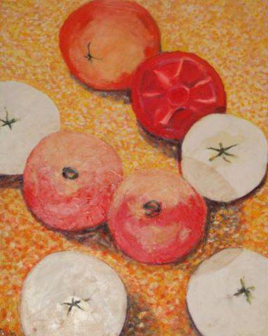 Na obrazie widzimy kompozycję kilku jabłek ułożonych na ciepłym, złocistym tle. Różnorodność kształtów i odcienie czerwieni, różu oraz bieli przyciągają wzrok. Jabłka są rozrzucone jakby przypadkiem, ale to właśnie ta spontaniczność dodaje uroku. Malowane z lekkością, artysta zastosował technikę impresjonistyczną, mieszając kolory i miękko rozpraszając światło. Uczucie ciepła i domowego spokoju emanuje z obrazu, przypominając o letnich dniach spędzonych w sadzie. Ktoś może poczuć nostalgię, inni głód - patrząc na soczyste czerwienie. Feeria barw jest żywa, choć delikatna, jakby ktoś rozlał farby na płótnie i pozwolił im same się zmieszać. Osobiście, ten obraz to dla mnie powrót do dzieciństwa. Jabłka wyglądają smacznie i są apetyczne, a jedna z nich przypomina nawet taką, którą namalowałbym na zajęciach plastyki w szkole. Wow, jak proste są czasem najlepsze pomysły! Tło wydaje się 'fuzzy', przez co całość ma nieco rozmyty, senne klimaty. Taki obraz z łatwością można sobie wyobrazić w przytulnej kuchni pełnej śmiechu i zapachu świeżo pieczonej szarlotki.