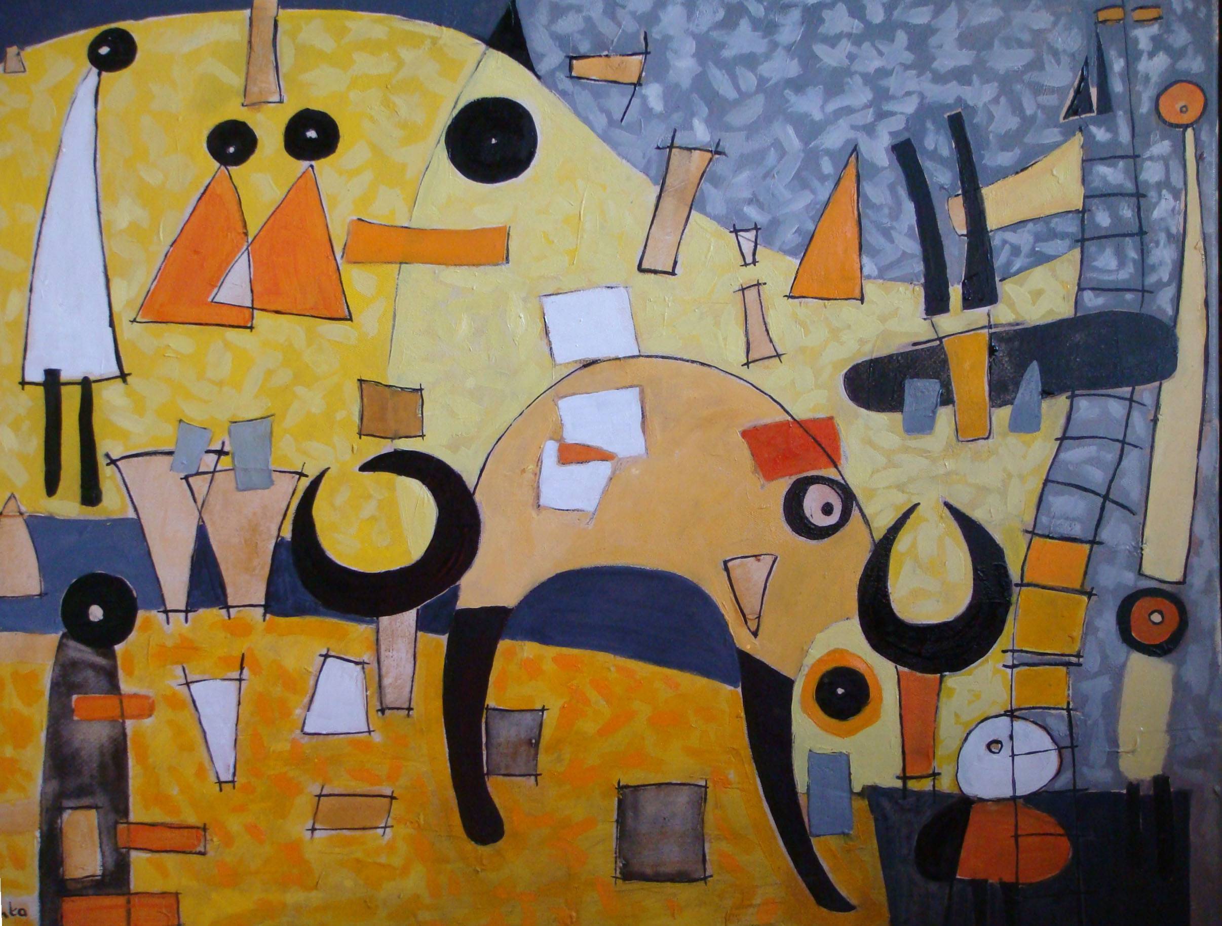 Obraz olśniewa feerią kolorów, w której dominują żółcie, pomarańcze i szarości, jakby ktoś rozsypał barwne skrawki papieru i zamknął je w harmonijnej kompozycji. Geometryczne kształty - trójkąty, koła i prostokąty - zdają się biegać po płótnie w chaotycznym tańcu. Taka radosna abstrakcja, która bawi oko, a jednocześnie zastanawia. Styl obrazu przypomina dzieła w nurcie abstrakcji geometrycznej, gdzie kształty i kolory są równie ważne jak emocje, które wywołują. Ten chaos, pełen niespodziewanych form, kreuje atmosferę pełną energii i dynamizmu. To jakby wejść do bajkowej krainy, gdzie wszystko wydaje się możliwe. A może nawet trochę surrealistycznie? Bo kto to wie. Technika pasty na powierzchni dodaje głębi i tekstury, sprawiając, że obraz wydaje się bardziej „żywy”. Patrząc dłużej, zaczynam się zastanawiać: co autor miał na myśli? Może to jego „free spirit” wyrażony pędzlem. Dla jednej osoby to uosobienie chaosu, dla innej - porządek w nieładzie. Kolory cieszą oko, a jednocześnie prowokują do refleksji nad sensem przypadkowości w naszym życiu. Podobnie jak dziecko, które mawia: „Wow, tyle barw, aż chce się tu skakać!” - obraz wyzwala energię i dziecięcą radość. Fascynujące dzieło, które wciąga jak magnes.