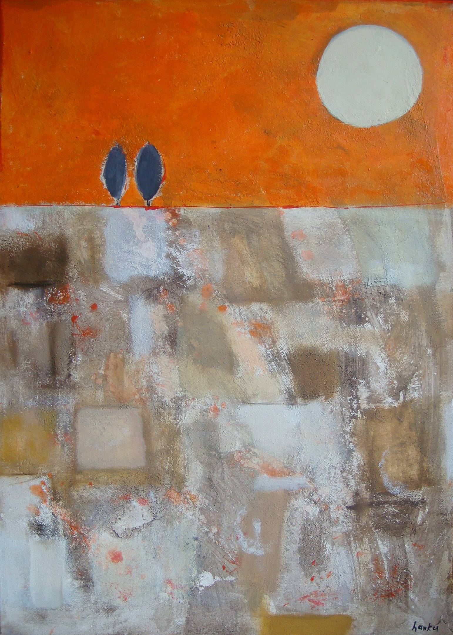Obraz emanuje ciepłem zachodzącego słońca. Dominująca pomarańczowa połać nieba przełamana jest dwoma ciemnymi, tajemniczymi liśćmi na pierwszy planie. To chyba drzewa? A może coś innego. Pod nimi rozciąga się jasna mozaika pełna brązów i beżów z delikatnymi przebłyskami białych i szarych tonów. W samym rogu rozlewa się bladobiała kula, przypominająca słońce, które wprowadza spokój i harmonię. Całość tworzy rustykalną, ale jednocześnie enigmatyczną atmosferę. Artysta zastosował impastowe techniki, co dodaje pracy tekstury i głębokości. Emocje wywoływane przez ten obraz to mieszanina nostalgii i zadumy. Trochę jakby zanurzyć się w jesienny wieczór. What a feeling! Patrząc na niego, każdy może poczuć, jakby czas na chwilę się zatrzymał. Może nawet usłyszeć szelest liści pod stopami. Rozmyta kompozycja z nutką abstrakcji sprawia, że dzieło można dowolnie interpretować. Raz jest to krajobraz, innym razem – wewnętrzny pejzaż emocji.