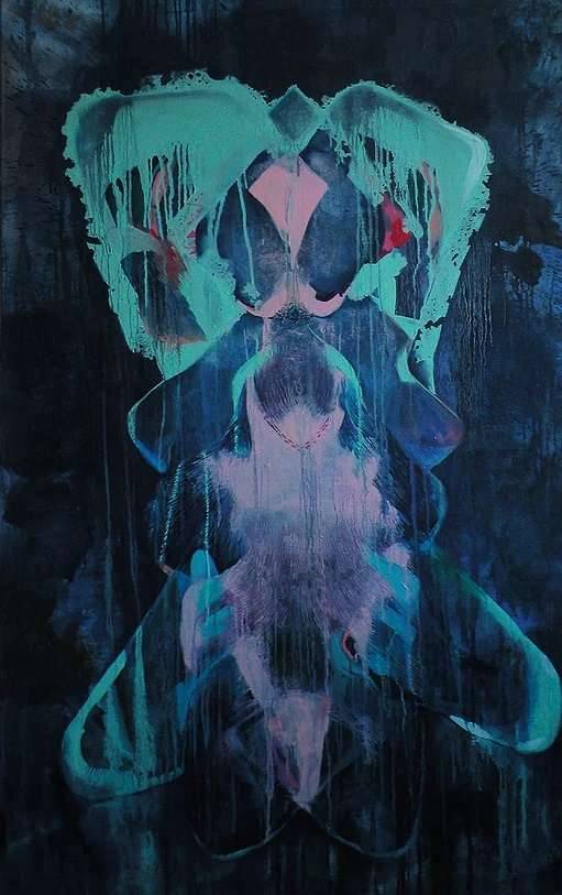 Obraz przyciąga wzrok swoją nieoczywistą formą i tajemniczą kompozycją. Ciągnie się na ciemnym, niemalże czarnym tle, z którego wyłaniają się kształty niczym z sennego koszmaru. Kolory rozmywają się, głównie zimne zielone i niebieskie barwy, przez które przebija czasem delikatny róż. Kształty są nieco rozmyte, zdają się płynąć, tworząc wrażenie ruchu. Na pierwszy rzut oka można dostrzec pewną symetrię, która prowadzi oko ku górze kompozycji. Atmosfera jest mroczna, nieco melancholijna, ale ma w sobie tę niesamowitą aurę tajemniczości. Czy to sztuka nowoczesna? Na pewno tak. Ten obraz emanuje głębszym znaczeniem, które trudno uchwycić. Artysta zastosował technikę dripingu, stwarzając zacieki, które dodają dramatyzmu. Malowanie wydaje się intuicyjne, niemalże spontaniczne, a jednocześnie przemyślane. Obraz może wyzwalać w odbiorcy sprzeczne uczucia. Na zmianę fascynację i niepokój. Jakby wejść w inny świat. Taki trochę creepy, ale intrygujący. Wyobraźnia zaczyna tańczyć, a myśli przeskakują od abstrakcji do konkretu. Jak mówił mały Jaś: "To wygląda jak kosmiczny motyl". Wciąga jak dobry thriller, każąc wracać po więcej. Ktoś mógłby powiedzieć, że to „mysterious”, a może nawet dziwaczny. Tak, to dobre słowo. Artysta pozostawia pole do własnych interpretacji, pozwalając każdemu widzowi napisać własną historię. Co ten obraz mówi o naszej podświadomości? Czy jesteśmy gotowi odkryć jego sekrety? Każdy znajdzie tu coś dla siebie, o ile ma odwagę patrzeć głębiej.